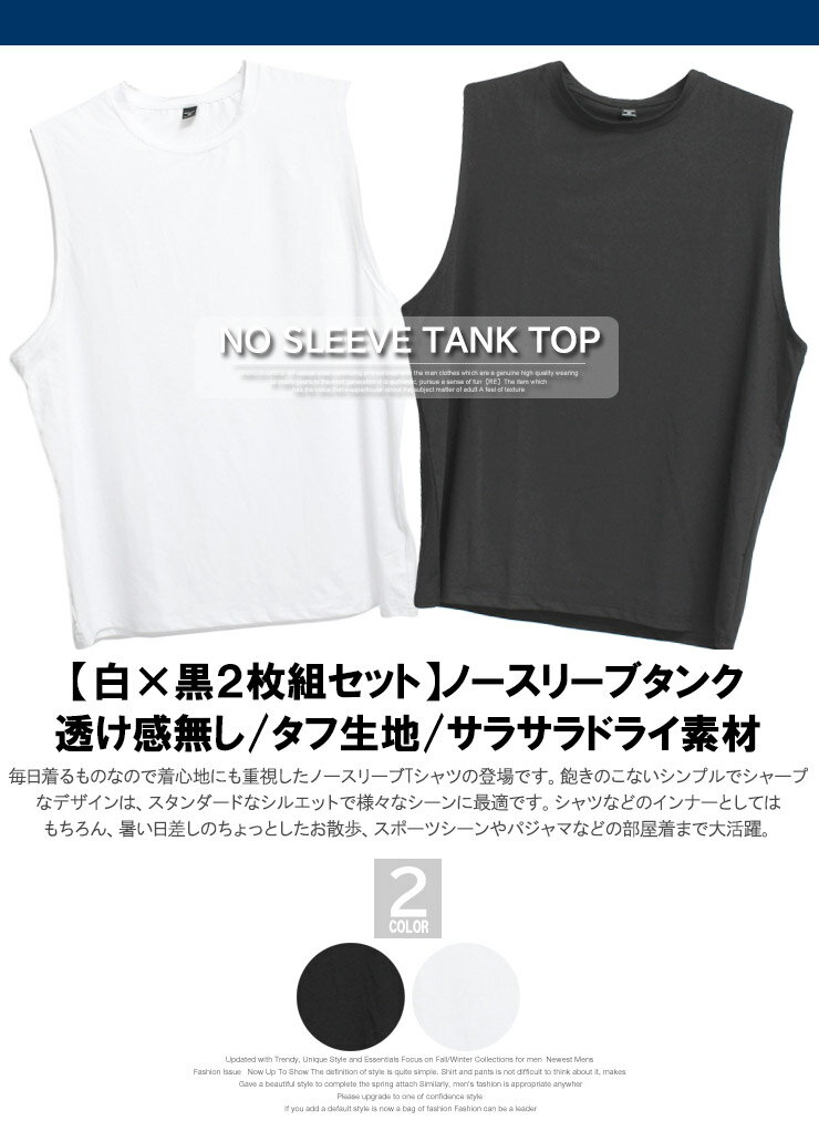 【メール便で送料無料】ノースリーブ Tシャツ メンズ 大きいサイズ 無地 クルーネック タンクトップ ホワイト ブラック 2枚セット セット組 インナー トップス スポーツ トレーニングウェア 袖なし 白 黒 ホワイト ブラック ストリート系 ワークマン プラス