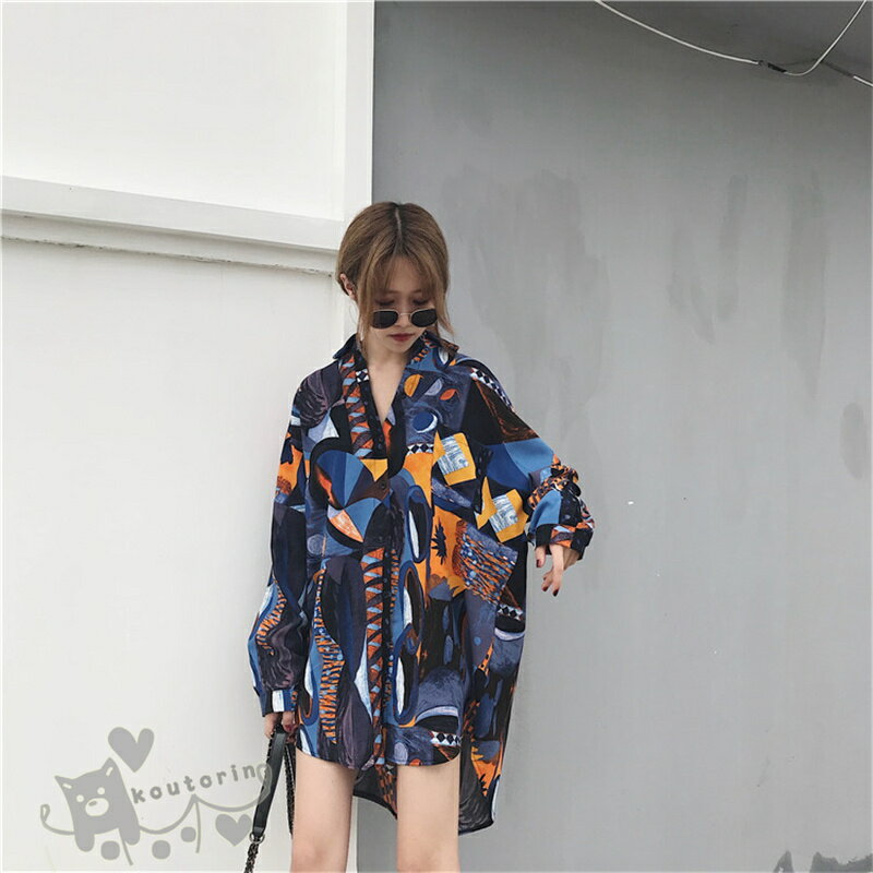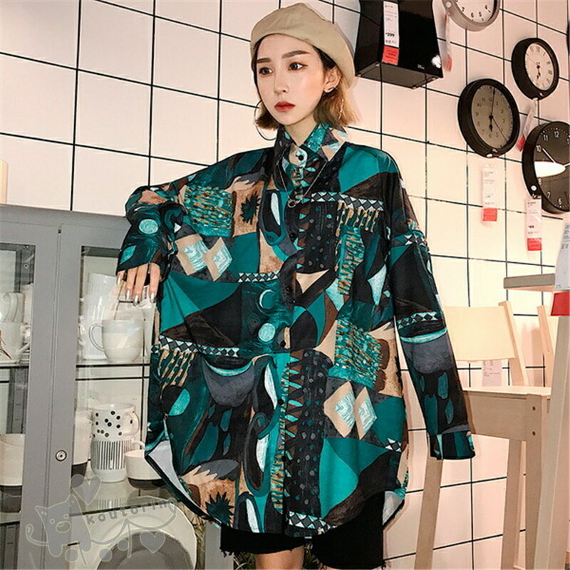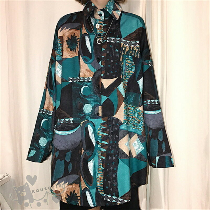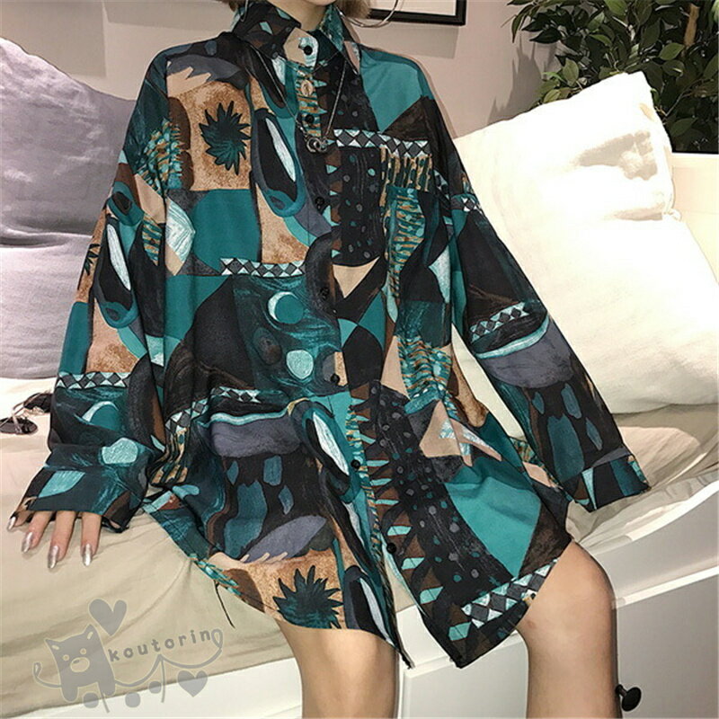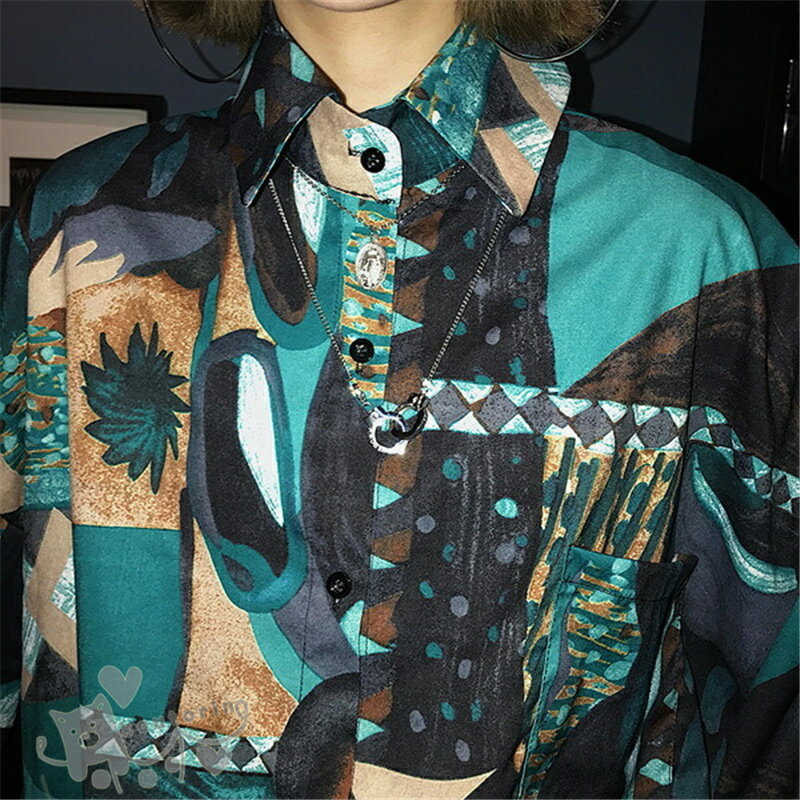 即納シャツ ダンス衣装 シャツ ブラウス 長袖 配色 総柄 幾何学模様 絵画 アート ビッグシルエット トップス ヒップホップ コスチューム 韓国ファッション かっこいい 個性的 服 原宿系 演出服 送料無料