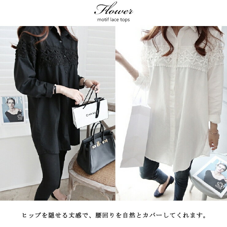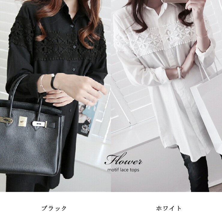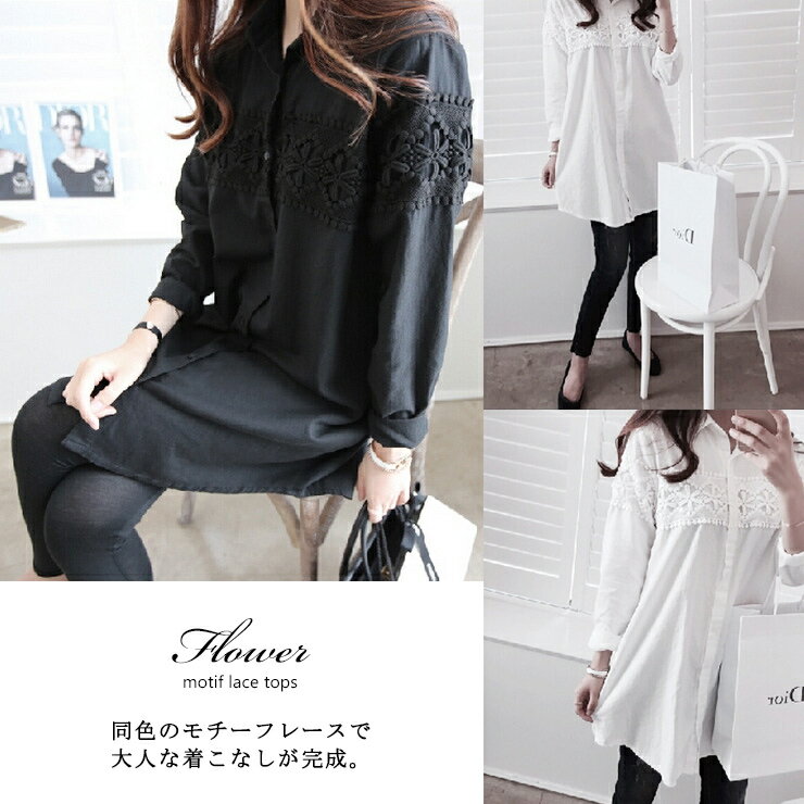 大きいサイズ レディース チュニックシャツ 長袖 ブラウス 無地 花柄レース 春 秋 M L LL 3L 4L 5L ブラック ホワイト