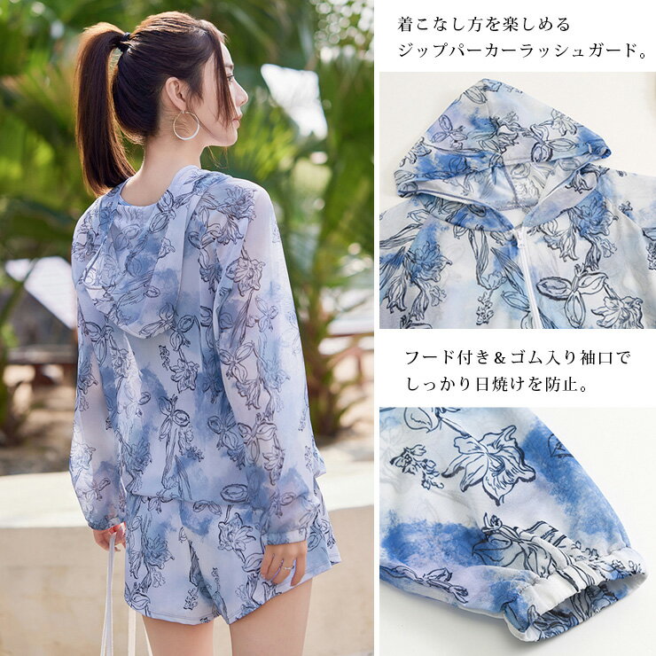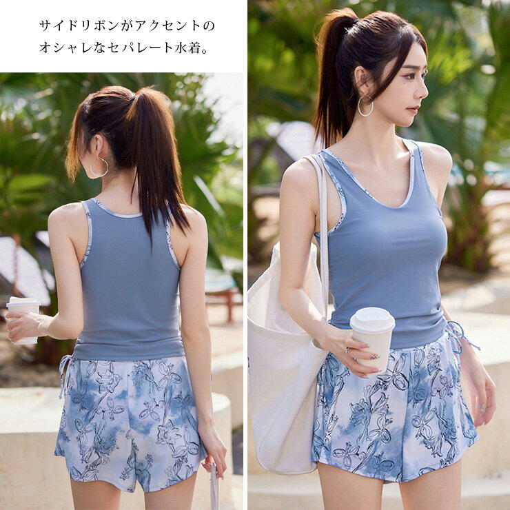 大きいサイズ レディース フィットネス水着 セパレート ラッシュガード タンクトップ パンツ 3点セット L LL 3L 4L 5L 6L ブルー