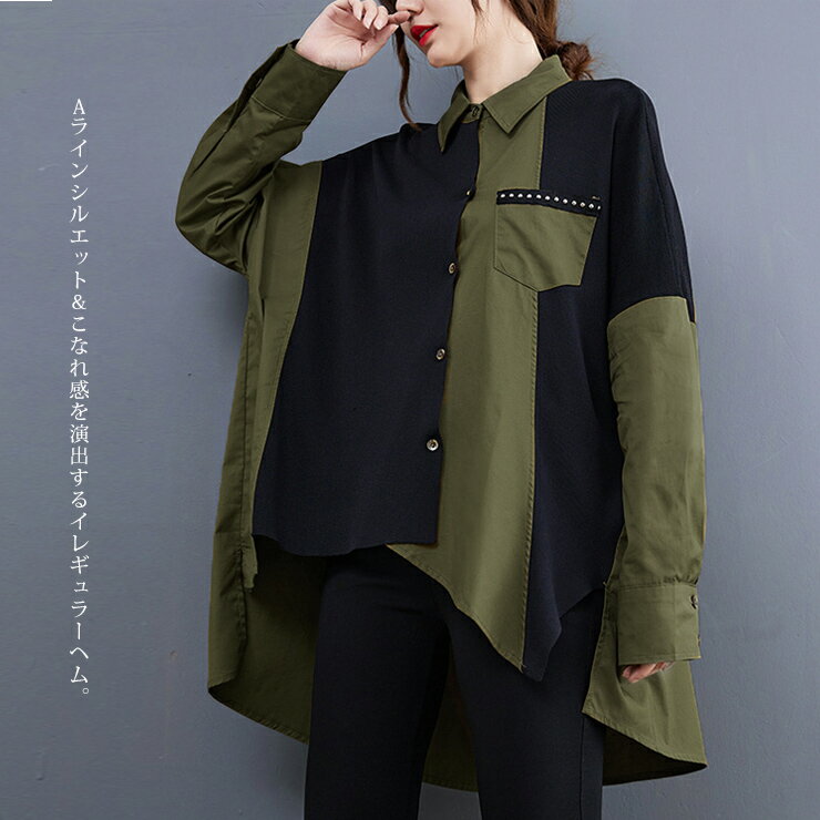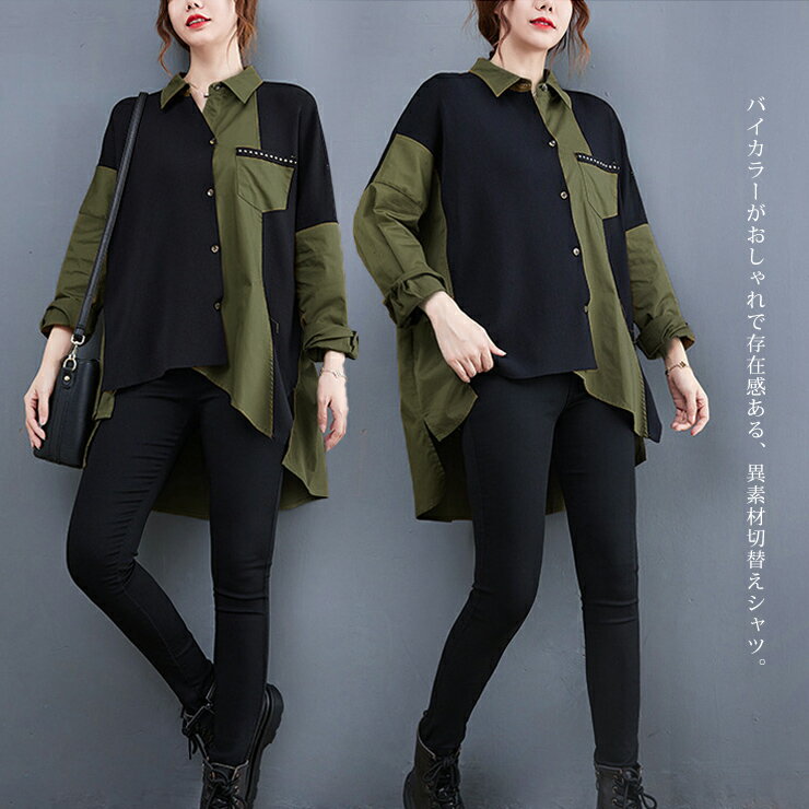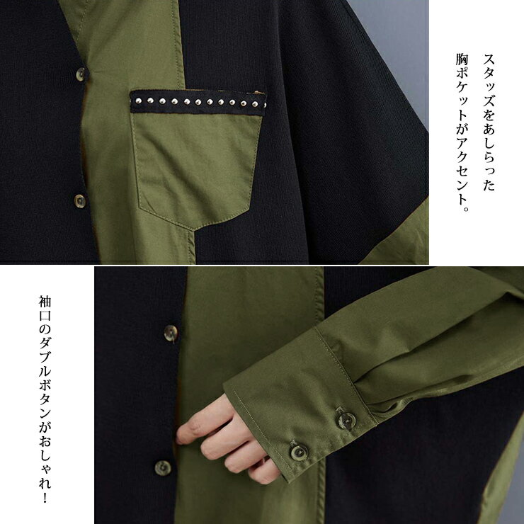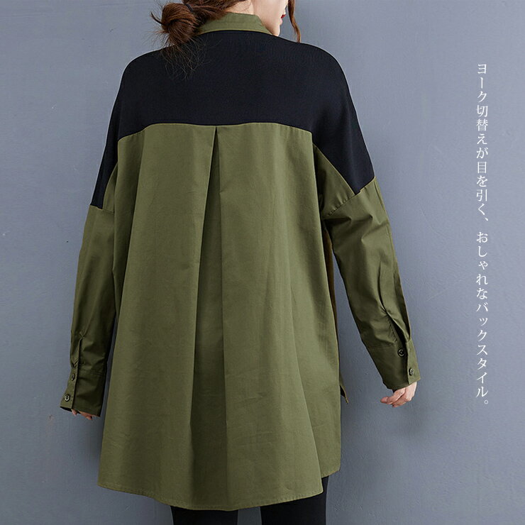 大きいサイズ レディース チュニックシャツ 切り替えシャツ 長袖 ブラウス 配色 ミリタリー カーキ 秋 春 LL 3L 4L 5L 6L ブラック
