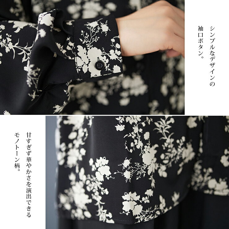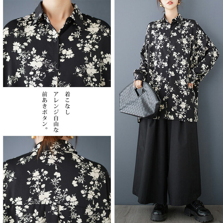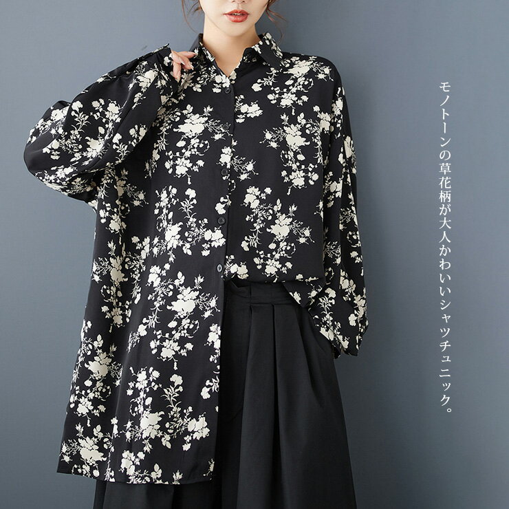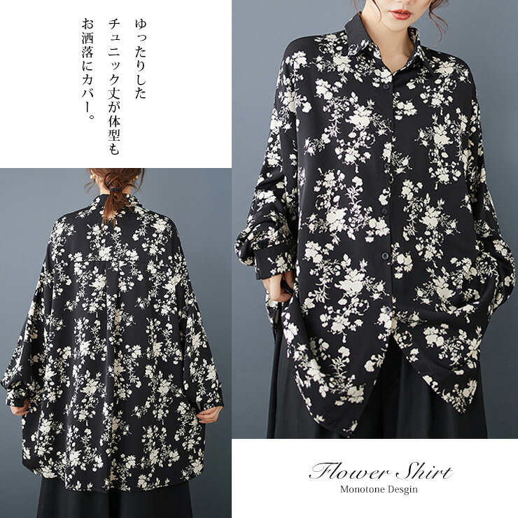 大きいサイズ レディース チュニック ブラウス オーバーシャツ とろみブラウス ロング 花柄 モノトーン 長袖 春 秋 LL 3L 4L 5L 6L ブラック