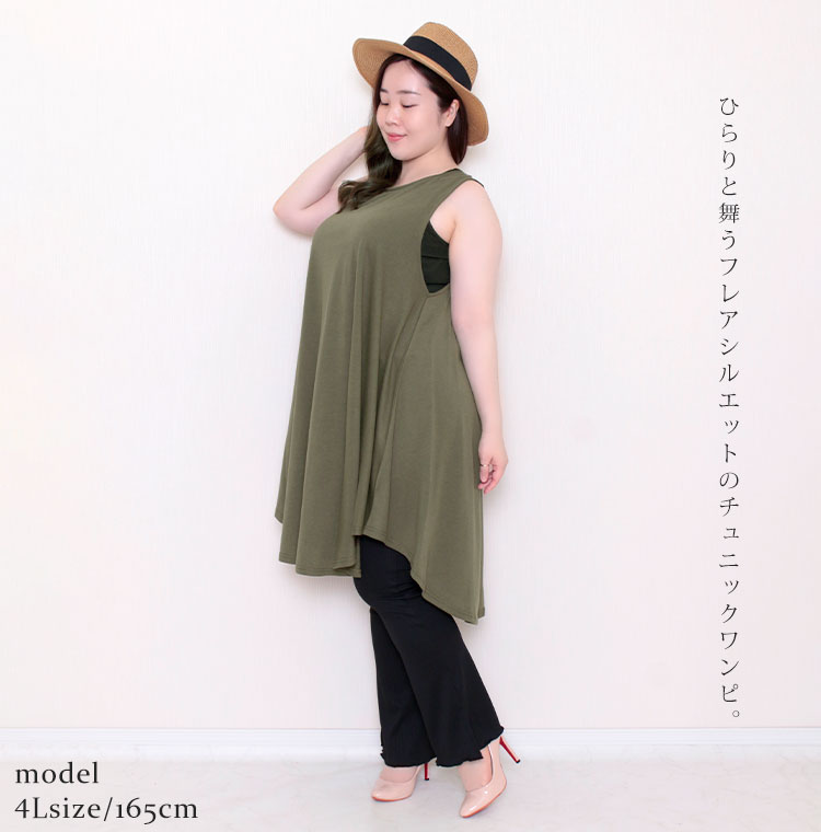大きいサイズレディース チュニック ノースリーブチュニックワンピース チュニックワンピ ノースリーブ ロング ひざ丈 フレア テールカット ドレープ フィッシュテール 袖なし Aライン ルーム 無地 夏新作 春服 夏服 LL 2L 3L 4L 5L ブラック 黒 カーキ 韓国ファッション
