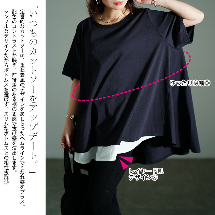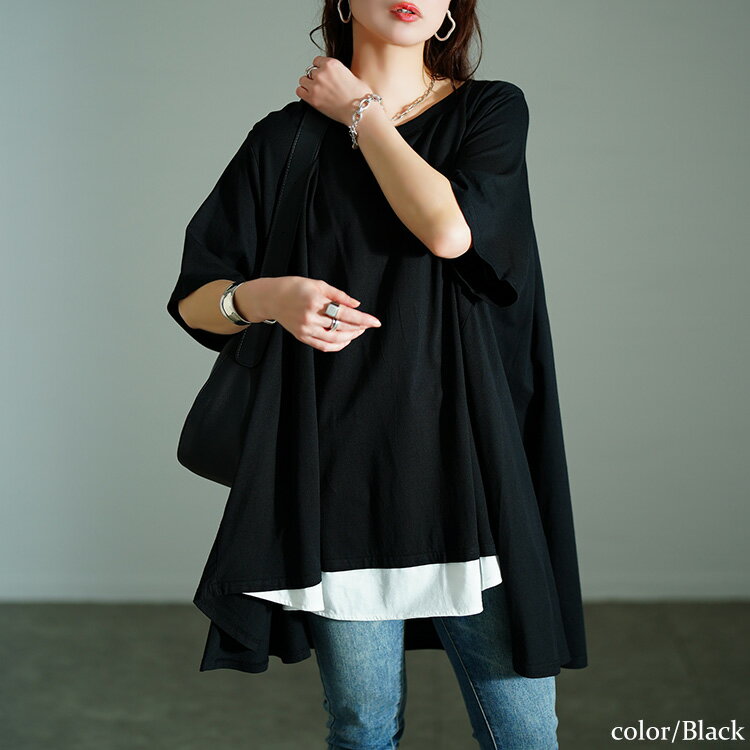 大きいサイズ レディース チュニック 裾フェイクレイヤードチュニック ロング 半袖 5分袖 ロング フェイクレイヤード ドルマン ラウンドネック ストレッチ テールカット Aライン フレア 春新作 春服 夏服 秋 LL 2L 3L 4L 5L ブラック 黒 ネイビー 杢グレー 韓国ファッション