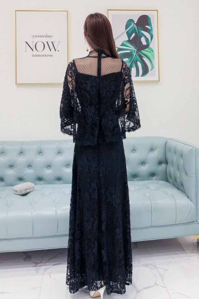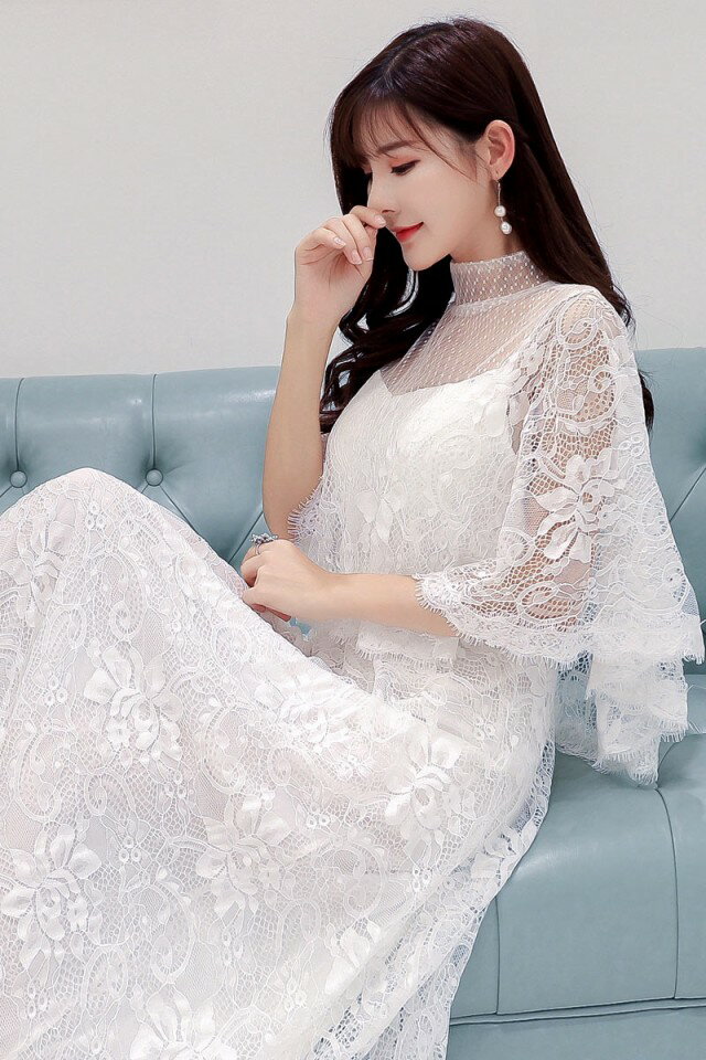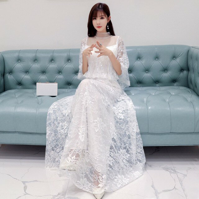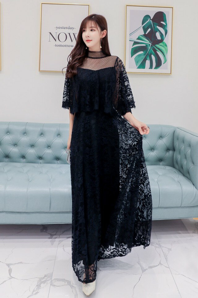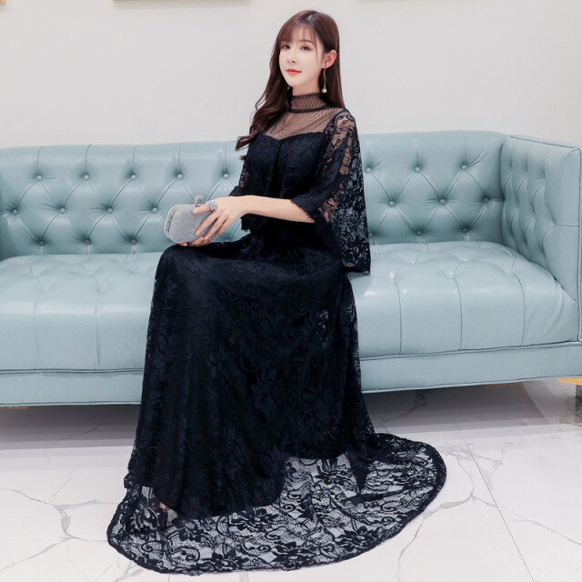 パーティードレス ロング 袖あり ケープスリーブ マキシ丈 総レース シアー 黒 白 ワンピース ハイネック ロングドレス 結婚式 お呼ばれ ドレス 韓国 演奏会 二次会 花嫁 袖付き 五分袖 花柄 発表会 大きいサイズ 3L 4L 5L 20代 30代 40代 50代