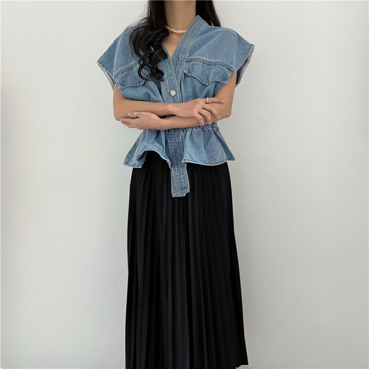 【全品半額クーポン発行中】ウエストマーク デニム ベスト ジレ ショート丈 トップス ノースリーブ ペプラム カジュアル きれいめ 夏 おすすめ レディース オシャレ トレンド 人気 プチプラ 韓国ファッション【2061-brc1012】【予約販売:15-20日】【送料無料】宅込