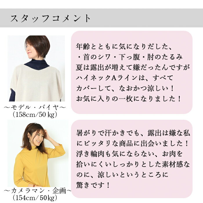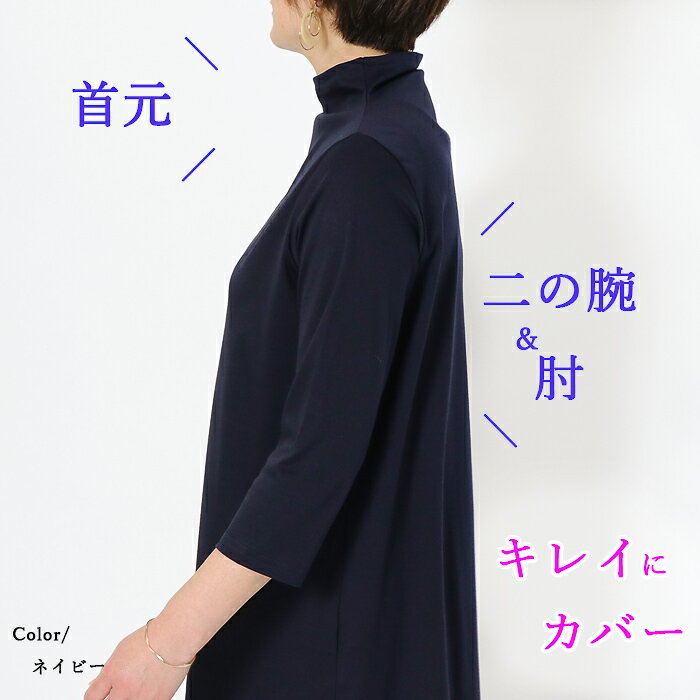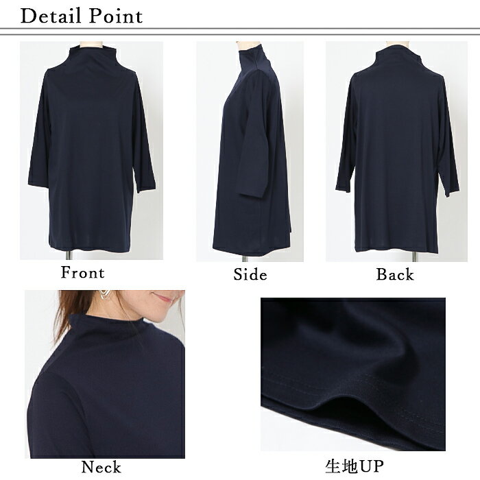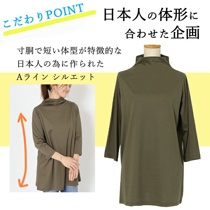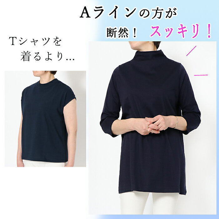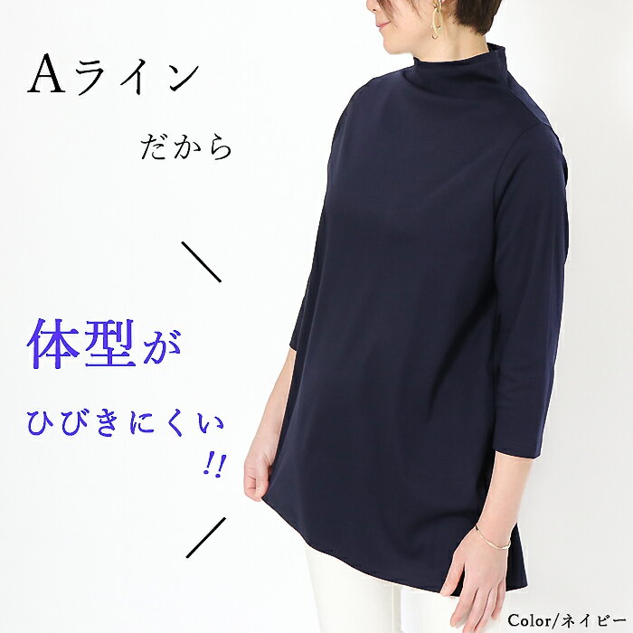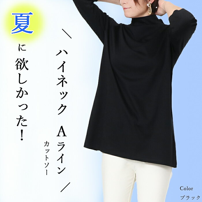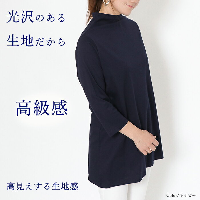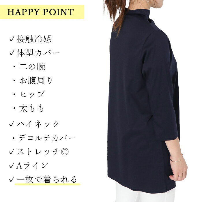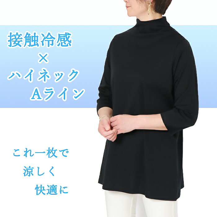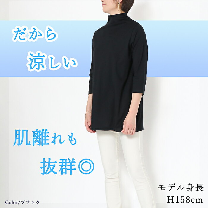 1枚で着られる ハイネックカットソー 細見えチュニック丈 夏用 7分袖 綿100% 接触冷感 レディース トップス 日本製 Aライン おしゃれ おすすめ ハイネックコーデ 超長綿使用 uv 春夏 黒 タートルネック tシャツ 母の日 プレゼント
