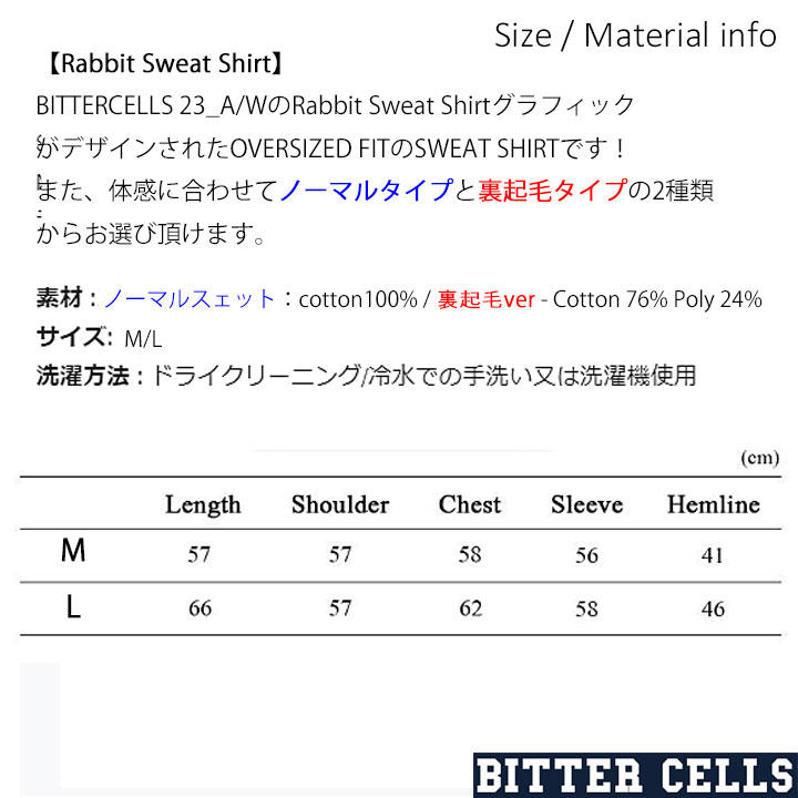 【NEXT韓国ヒットブランド】【正規品付属のタグ・袋付き】 韓国ファッション BITTERCELLS Rabbit Sweat Shirt レディース 長袖 サイズM/L 起毛あり 起毛なし 2タイプ ストリートファッション