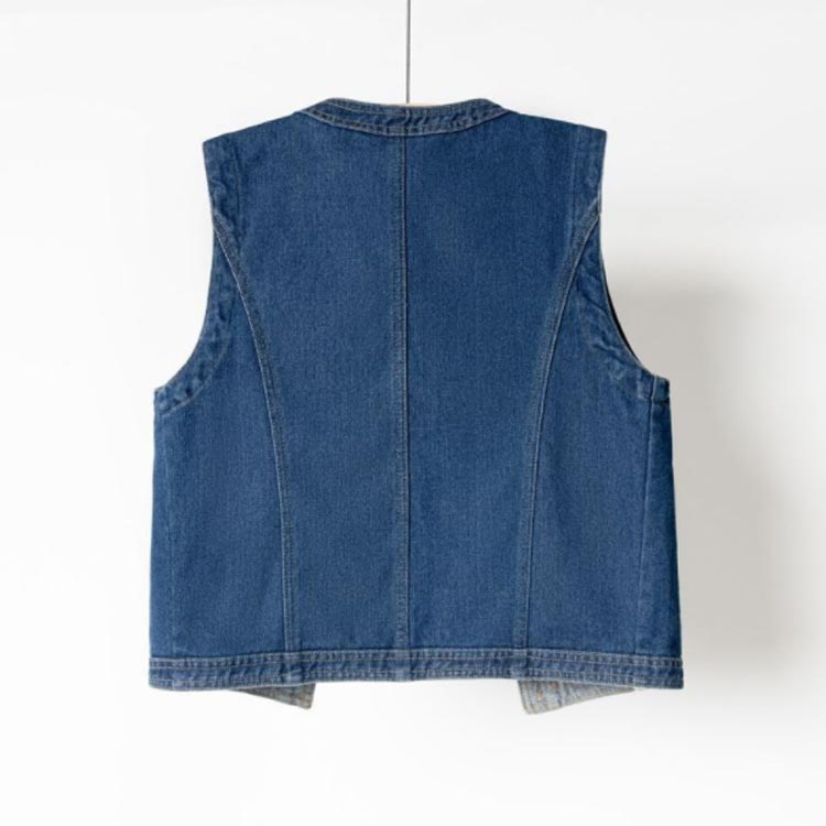 デニムベスト レディース ノーカラー ジーンズベスト ショート丈 ノースリーブ トップス カジュアル デニムアウター 羽織 ジレ 無地 シンプル 重ね着 レイヤード アウター 前開き ゆったり 体型カバー トレンド 着回し 20代 30代 40代
