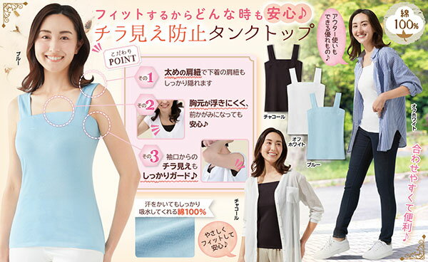 綿100%チラ見え防止タンクトップ セルヴァン 選べる4カラー ブラの肩紐も見せない メール便送料無料