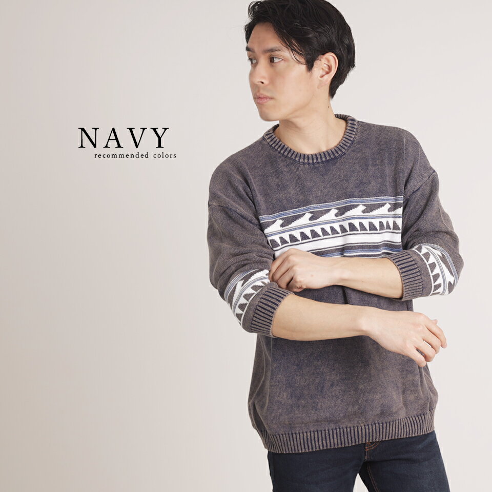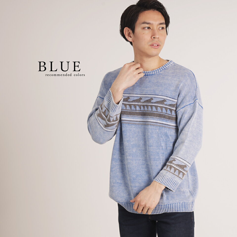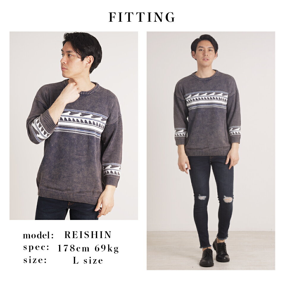 ジャガードクルーネック8分袖ニット ニット 春ニット 春 春コーデ 海 西海岸 サーフ系 ビター お兄系 サファリ ハーマン メンズニット メンズファッション セール 激安