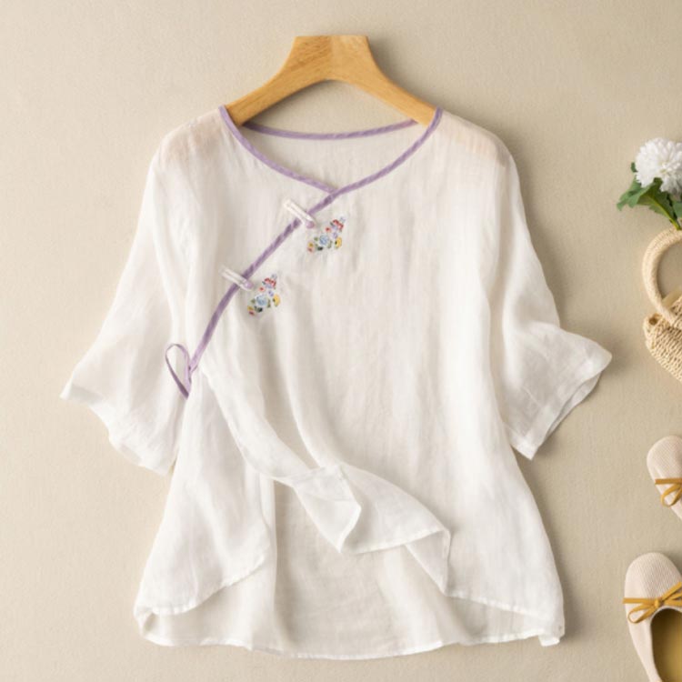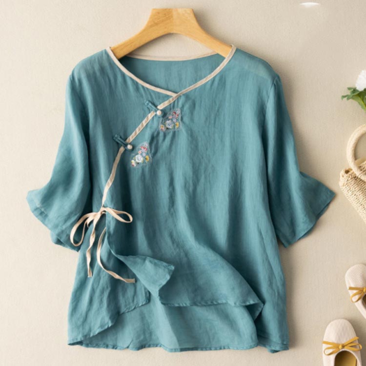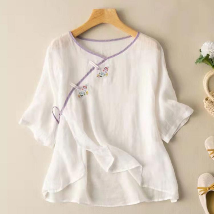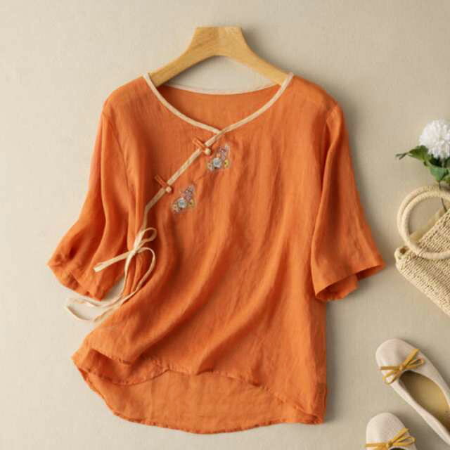 リネンブラウス チャイナボタン 民族風 レディース リネントップス レトロ カジュアル 文芸 シンプル 7分袖 トップス 半袖 春秋 春夏 Tシャツ ゆったり チャイナボタン 復古 花柄