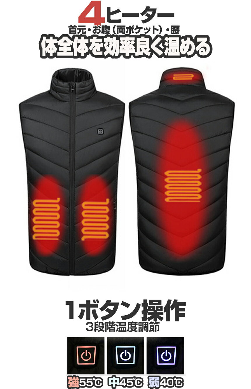 【4ヒーター 電熱ベスト 日本製発熱材 ヒーターベスト 男女兼用 】防寒 防風 撥水 USB給電 バッテリーセットあり 水洗い 冬対策 防寒ベスト 防寒グッズ 防災グッズ 温度調節 大きいサイズ 暖房服 防寒ウェア キャンプ バイク