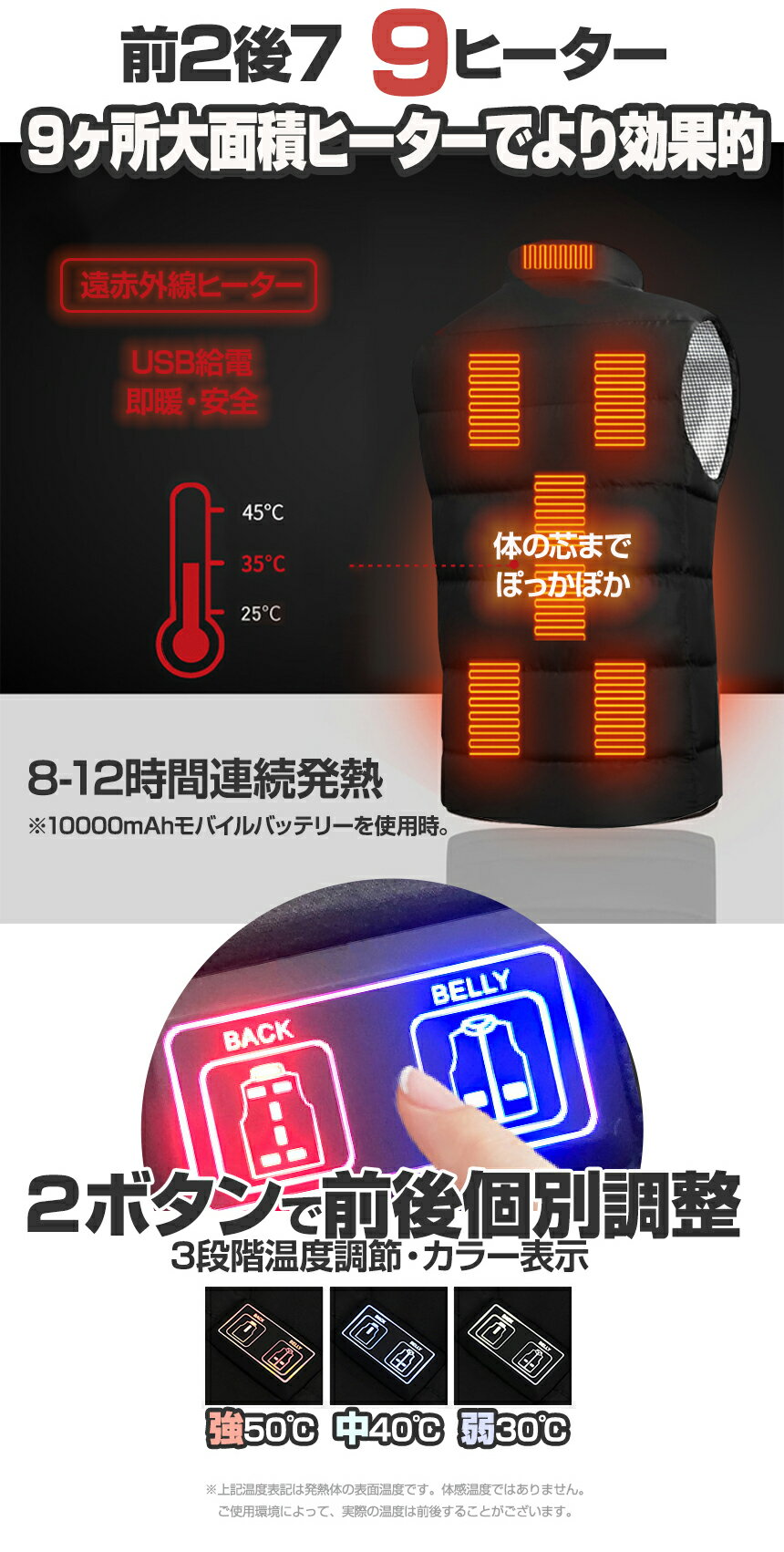 【9ヒーター 電熱ベスト 日本製発熱材 ヒーターベスト 男女兼用 】防寒 防風 撥水 USB給電 バッテリーセットあり 水洗い 冬対策 防寒ベスト 防寒グッズ 防災グッズ 温度調節 大きいサイズ 暖房服 防寒ウェア キャンプ バイク