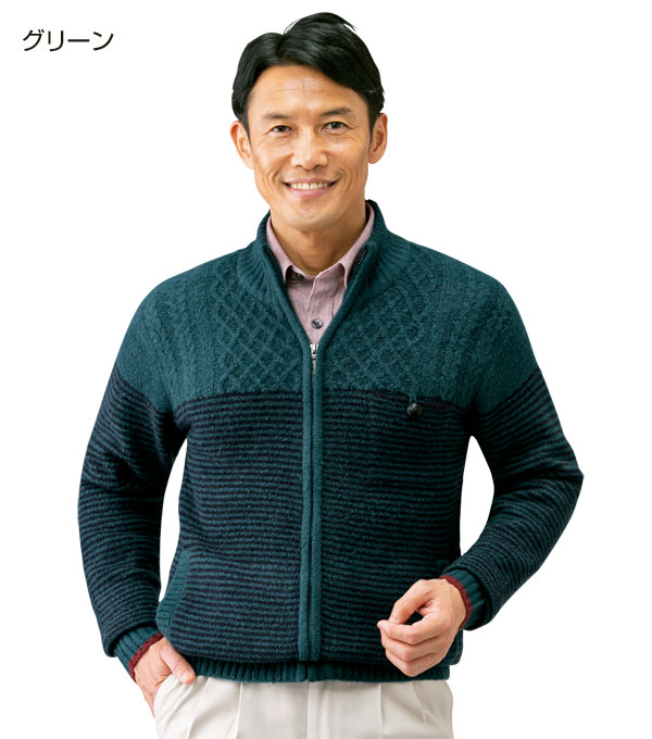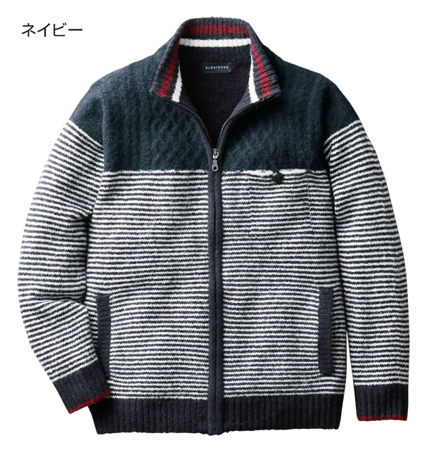ボーダー柄切替フルジップセーター ボタン付胸ポケット アルバトロス 秋冬 40代 50代 60代 957612