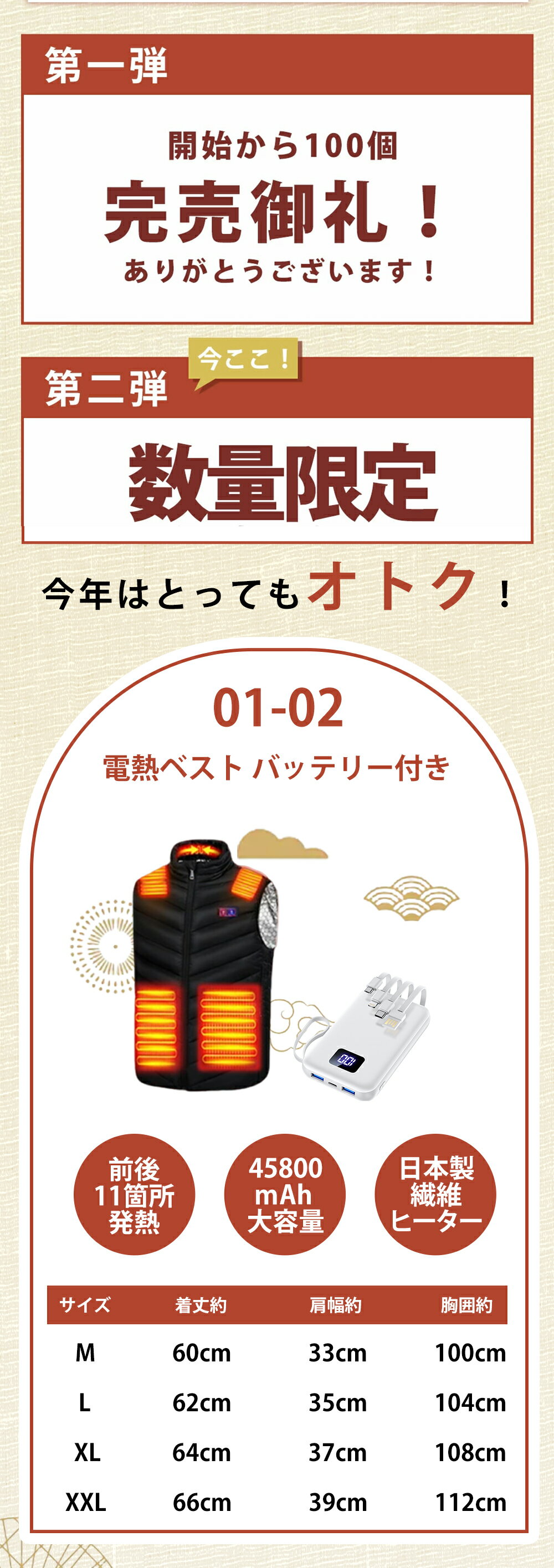 【7,992円&クーポン利用で!】 緊急企画★ \楽天1位/ 福袋 2025 2024 福袋登場 電熱ベスト インナー バッテリー付き 30000mAh 大容量 長袖 レディース 防寒 ポカポカ 福袋 ギフト クリスマス プレゼント 送料無料