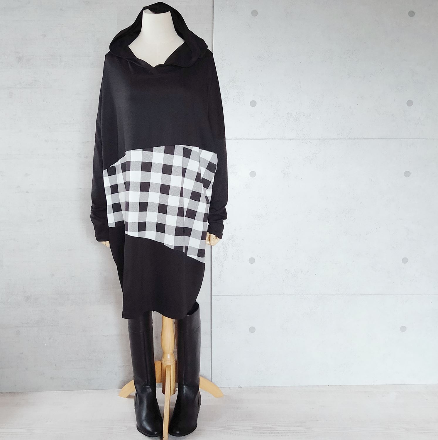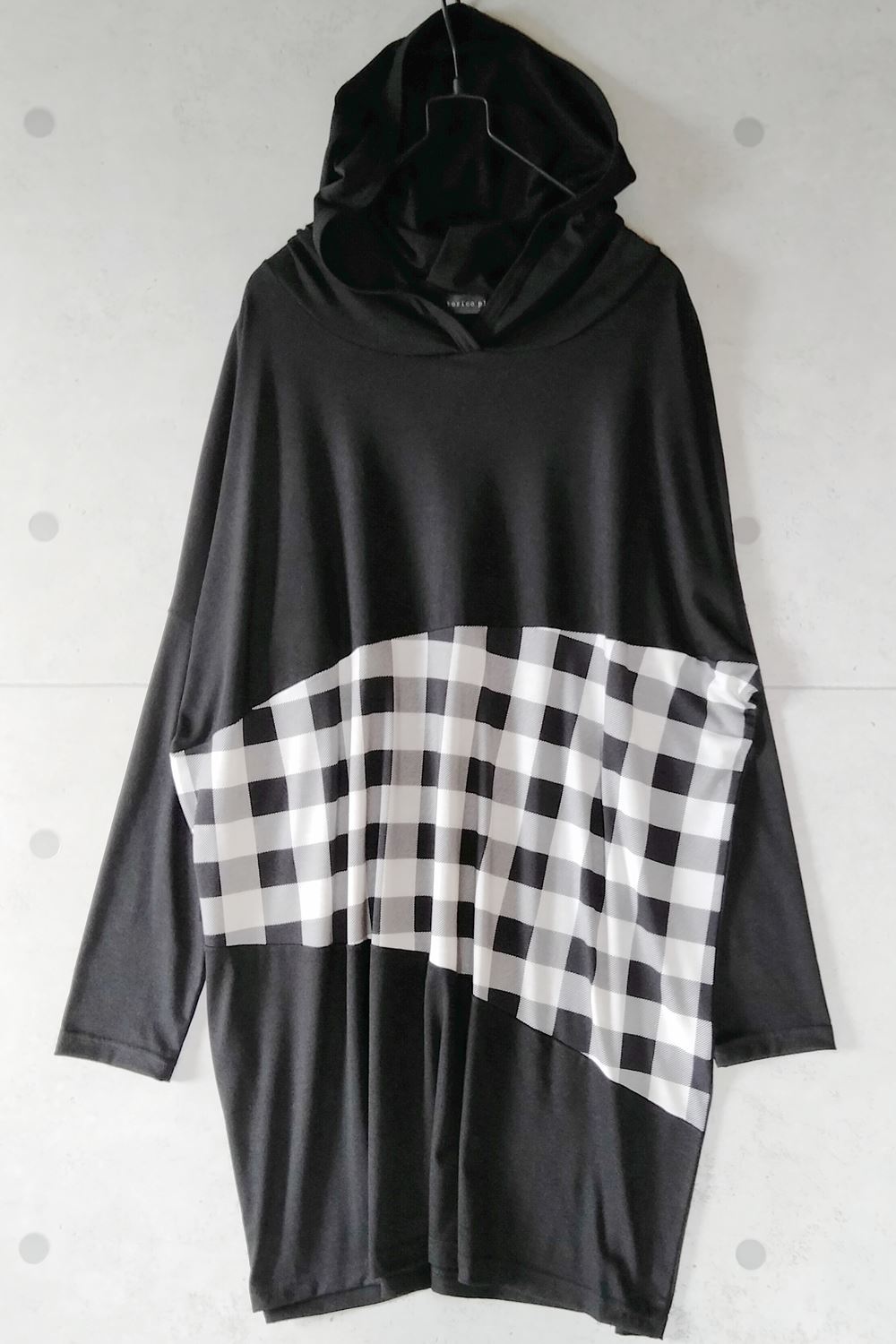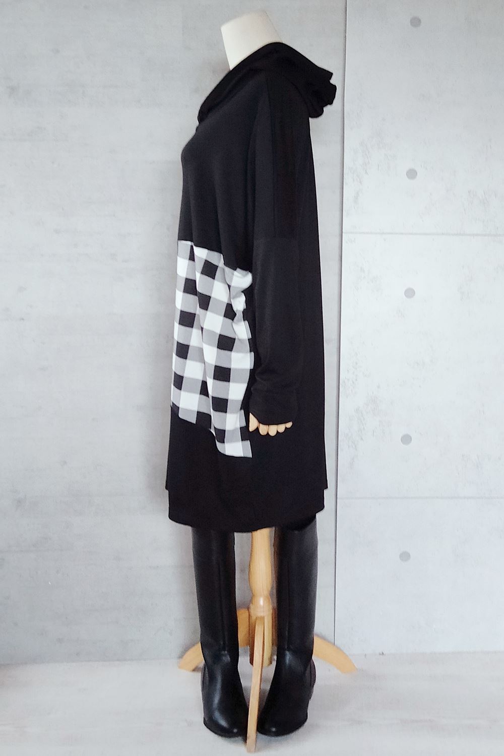 パーカー チュニック ワンピース ゆったり 春 長袖 大きいサイズ カットソー トップス ドルマン オーバーサイズ チュニックワンピ 配色 プルオーバー レディース フード バイヤス 黒×チェック