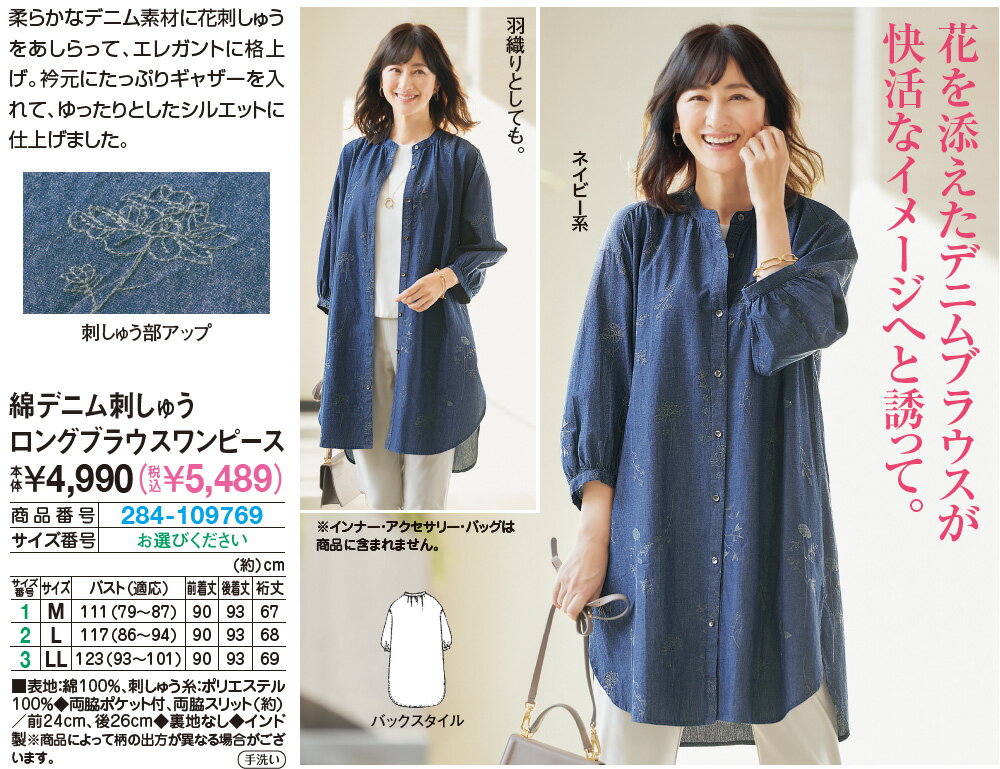 綿デニム刺しゅうロングブラウスワンピース<M L LL>