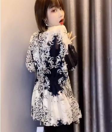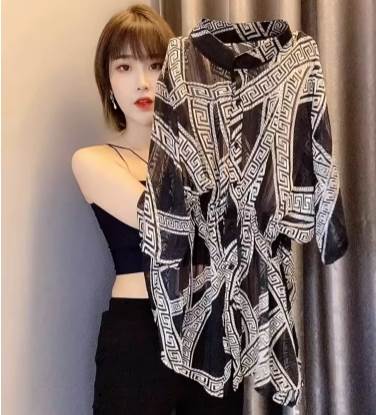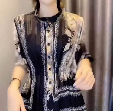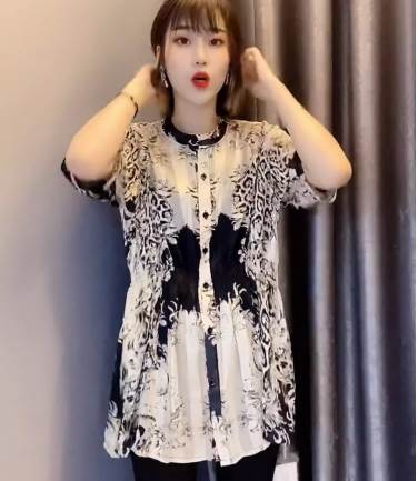 【P3倍&クーポン有】チュニック スタンドカラー トップス レディース 個性的 春 夏 秋 長丈トップス お尻カバー ポッコリお腹カバー 半袖 フレア Aライン 前開き 落ち感 透け感 ボタン ブラック 黒 総柄 サイズ豊富 M L XL LL 2XL 3L 3XL 4L 4XL 5L 大きいサイズ 薄手