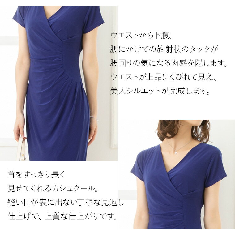 ワンピース:不二子 カシュクール ルミエール ◆opc6-050006 きれいめ 30代 40代 50代 着やせ 大人 上品 エレガント 大きいサイズ トールサイズあり タイトワンピース カシュクールワンピース ジャージー ドット柄 オフィス カジュアル 結婚式 膝丈 七分袖 春 秋冬