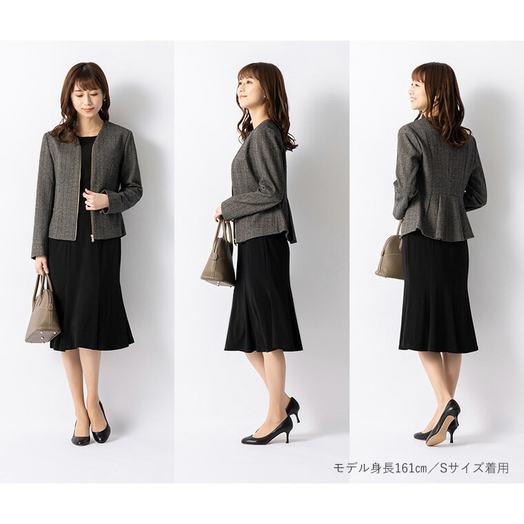 ジャケット:ノーカラージャケット ヘリンボーン ◆out010039きれいめ 30代 40代 50代 着やせ 大人 上品 エレガント ヒップアップ ウエスト細見えデザイン 大きいサイズブルゾン アウター 羽織り 裏地付 ストレッチ ジャージー 洗える オフィス カジュアル 長袖 秋冬
