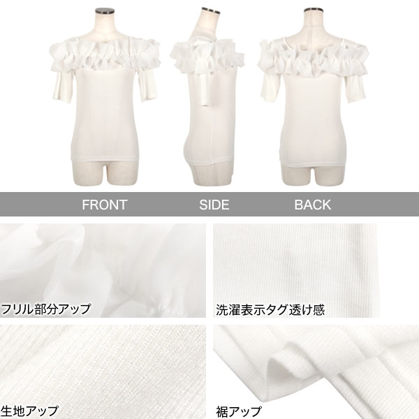 胸元 フリルトップス レディース 半袖 オフショル風 デザイン フリル トップス フェミニン きれいめ デザイントップス リブ カットソー オーガンジーフリル オーガンジー 光沢 高見え セレモニー 5分袖 丸首 白 ブラック 黒 水色 青 20代 30代 40代 [C7159] 【送料無料】