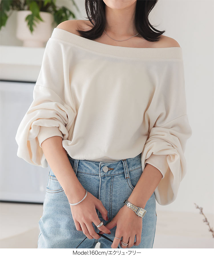 オフショル スウェット トップス レディース 長袖 オフショルトップス オフショルスウェット オフショルダー ボートネック デコルテ ショート丈 短丈 クロップド丈 ぽわん袖 ボリュームスリーブ グレー 黒 白 ゆったり 秋 春 冬 秋服 冬服 肌見せ 20代 30代 40代 [C7253]