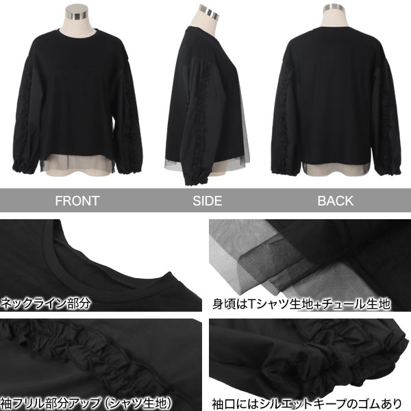異素材ギャザーフリルチュール重ねトップス [C7436] レディース 20代 30代 40代 チュール フリル ドッキング 異素材 ボリュームスリーブ バレエコア 長袖 ブラウス ロンT ぽわん袖 春 秋 ホワイト 白 グレー ブラック 黒 体型カバー お出かけ 華やか 大人可愛い