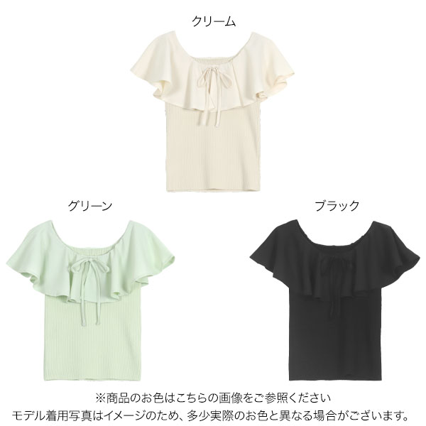 サマーニット 異素材 ブラウス [C7538] トップス レディース リボン ケープ ビッグ襟 半袖 着映え 光沢 リブ セーター 白 黒 緑 ホワイト クリーム ブラック グリーン リブニット ママ きれいめ お洒落 フェミニン 上品 仕事 涼しい フリル ゆったり 細見え 華奢