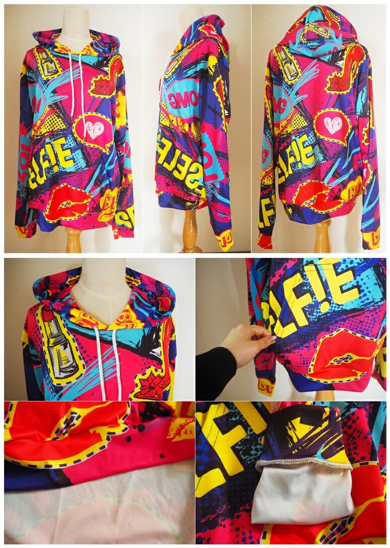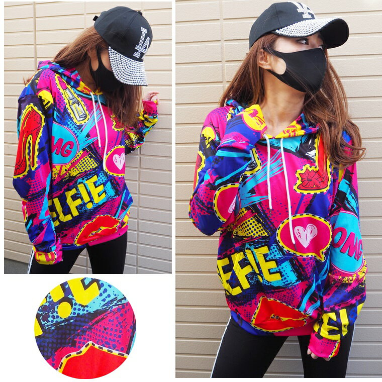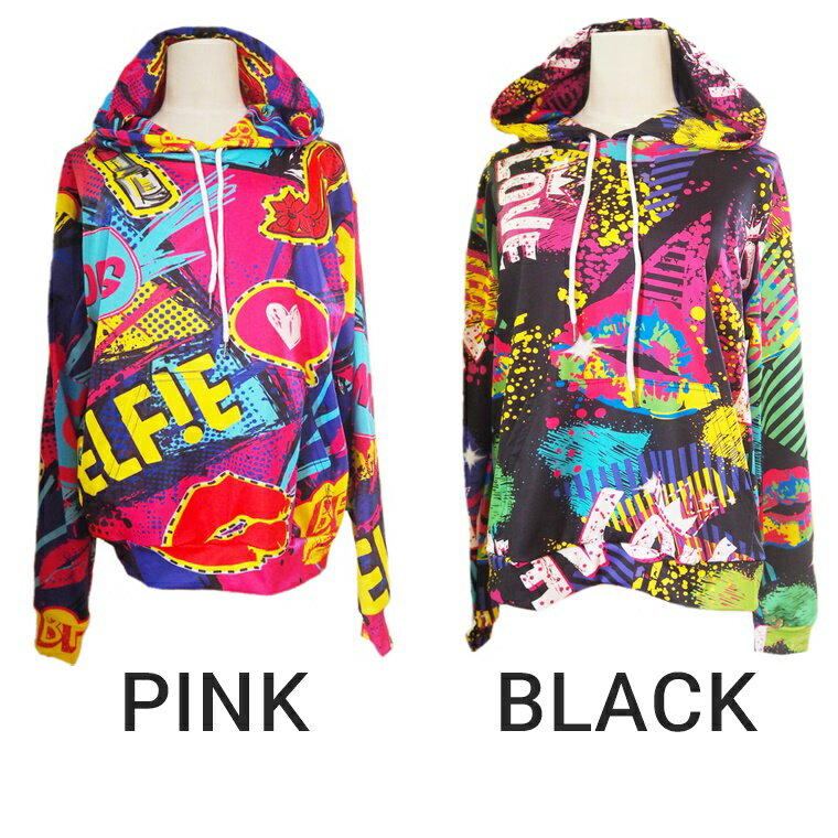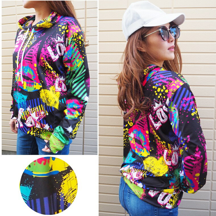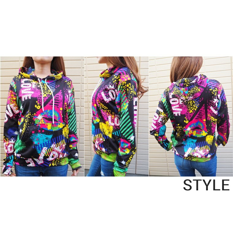 フード付きカラフルペイント柄プリントプルオーバーパーカー2色/トレーナー/ペンキ/長袖/総柄/ネオン/派手/蛍光/ライト/カラー/個性/原宿/ダンス衣装/イベント/ダンスウェア/リップ/ストリート/男女兼用/ユニセックス【ネコポス不可】