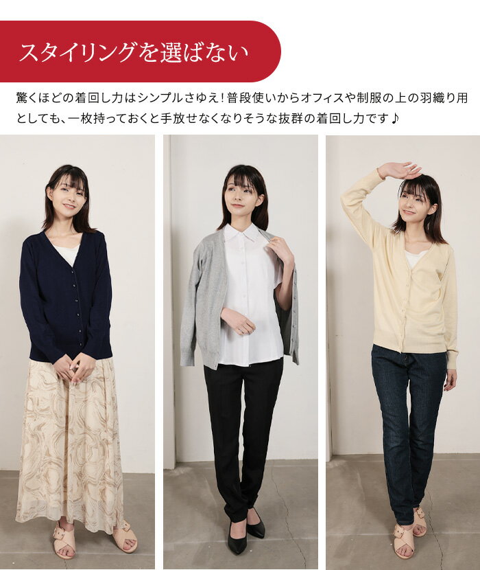 【スーパーSALE限定半額商品】 カーディガン レディース 秋 冬 長袖 Vネック 仕事用 ニット 薄手 リブ編み リブ加工 ミドル丈 春夏 シンプル 無地 オフィス 制服 事務服 白 黒 紺 レーヨン 伸縮性 カーデ きれいめ
