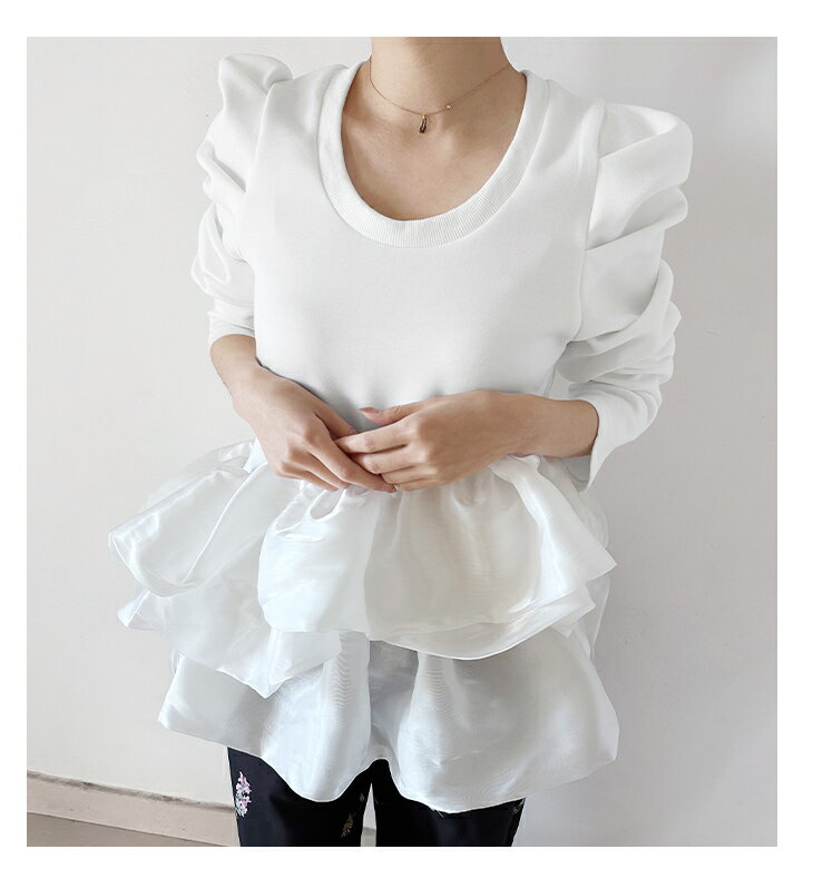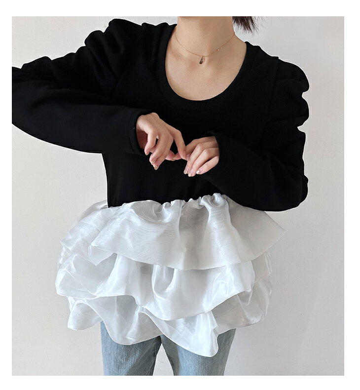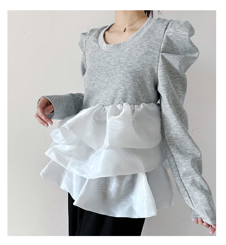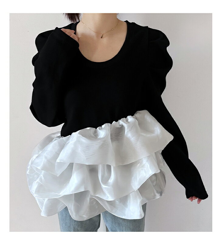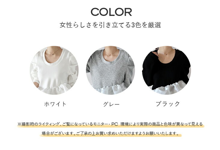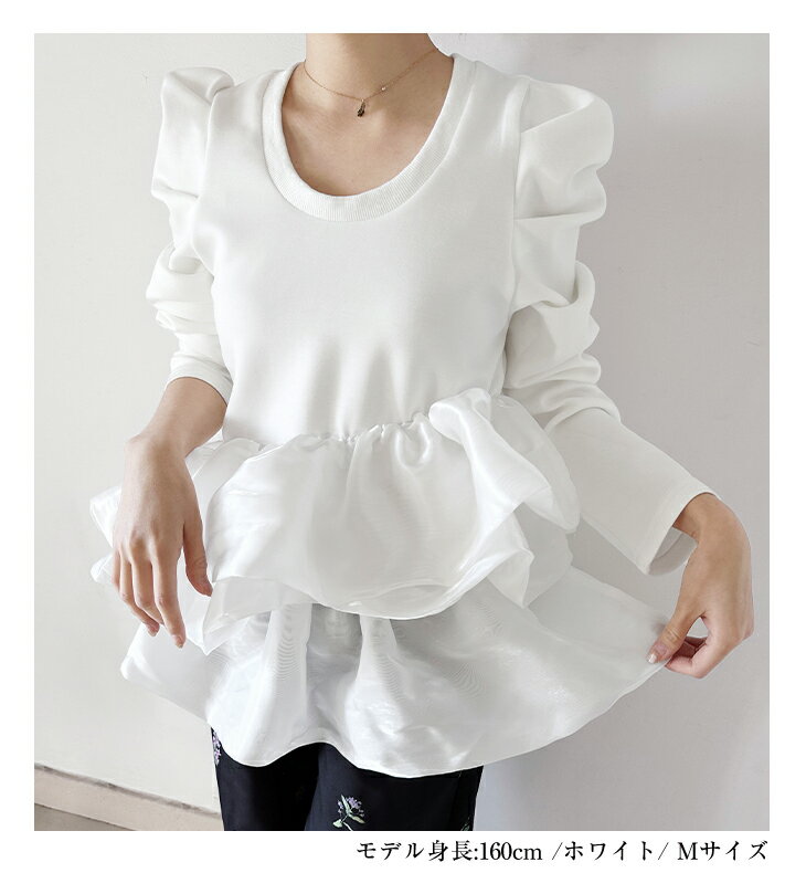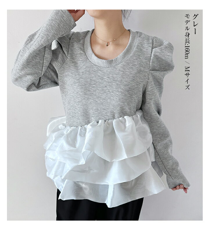 【3/27 01:59まで 50%OFF!2点購入クーポンで】バルーンフリル ドッキング ブラウス Tシャツ ラウンドネック トップス 長袖 レディースファッション ゆったり 楽ちん 体型カバー カジュアル コットン 綿 ふんわり 20代 30代 40代 50代 60代 ワンピスター 春 秋 新作