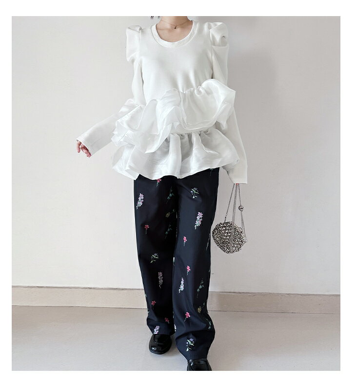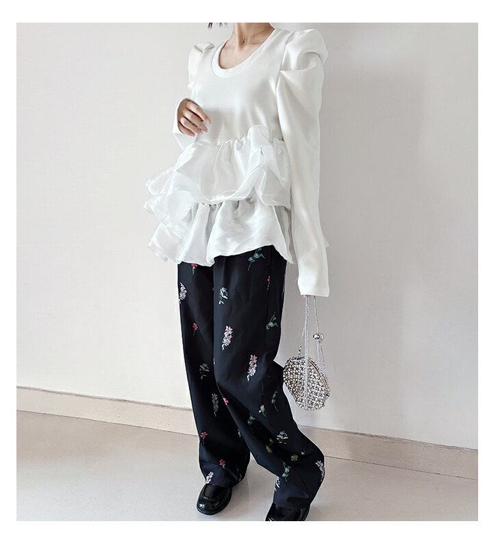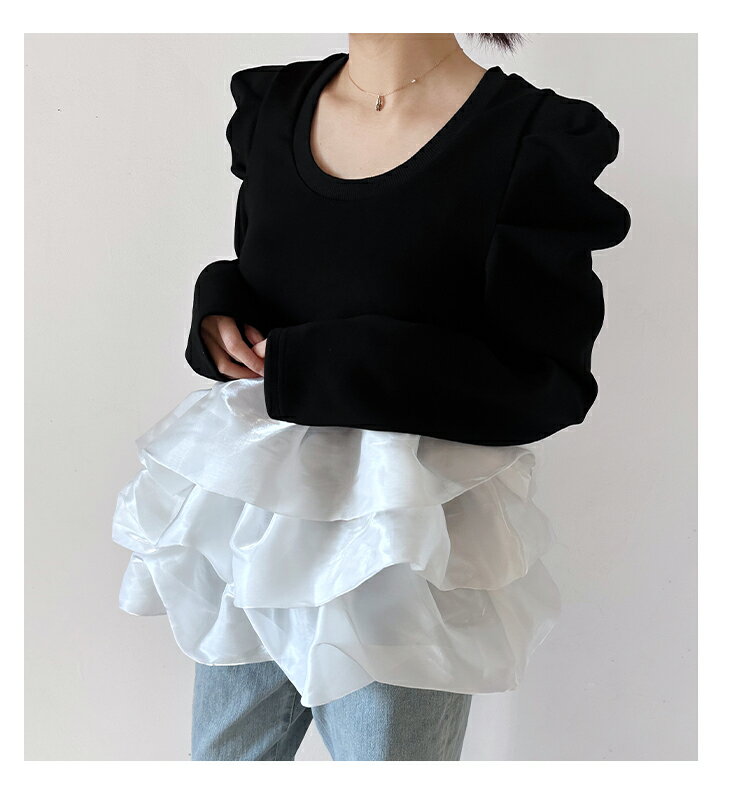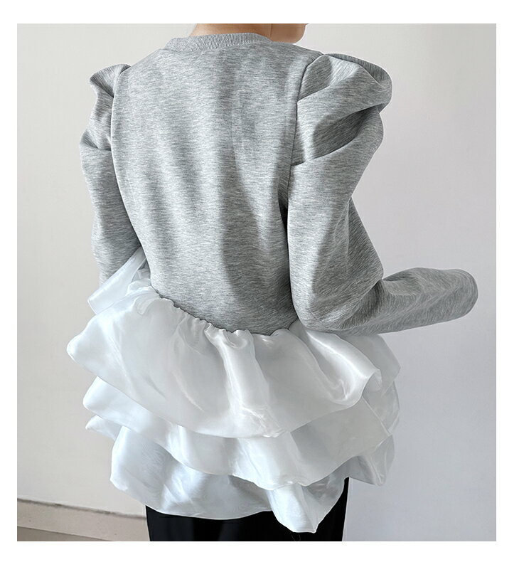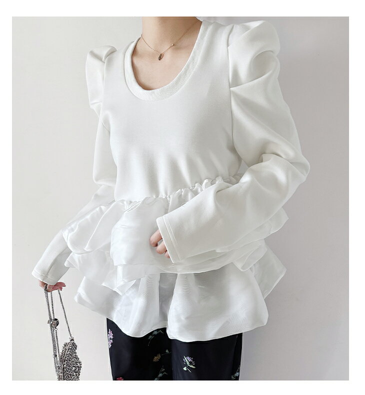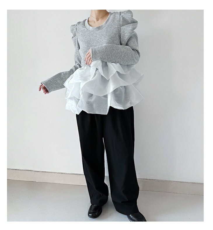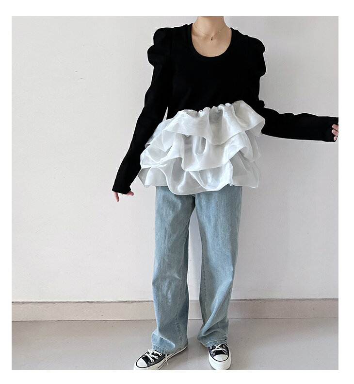 【3/27 01:59まで 50%OFF!2点購入クーポンで】バルーンフリル ドッキング ブラウス Tシャツ ラウンドネック トップス 長袖 レディースファッション ゆったり 楽ちん 体型カバー カジュアル コットン 綿 ふんわり 20代 30代 40代 50代 60代 ワンピスター 春 秋 新作