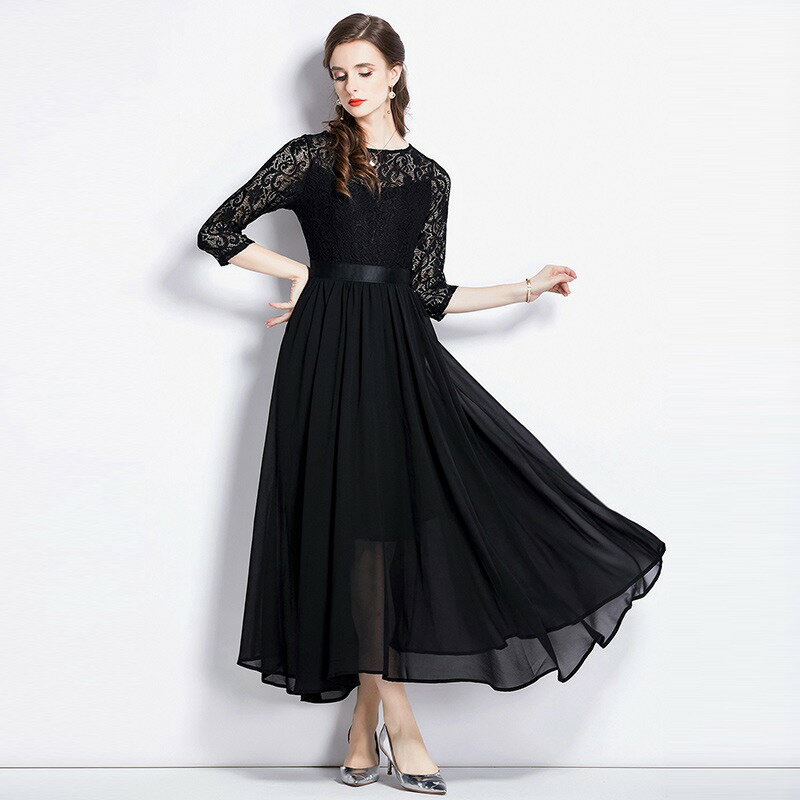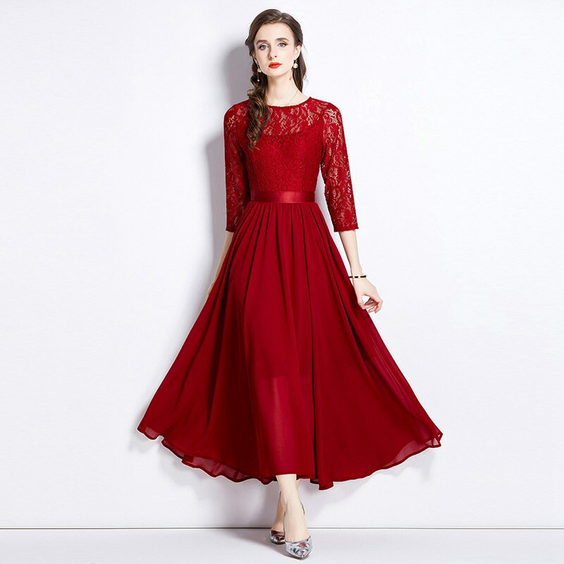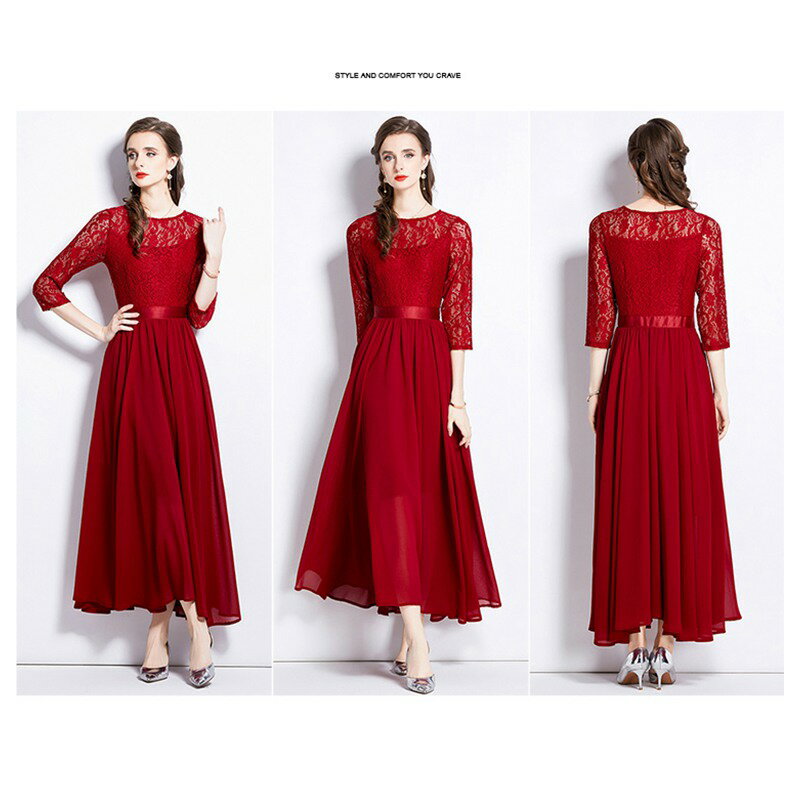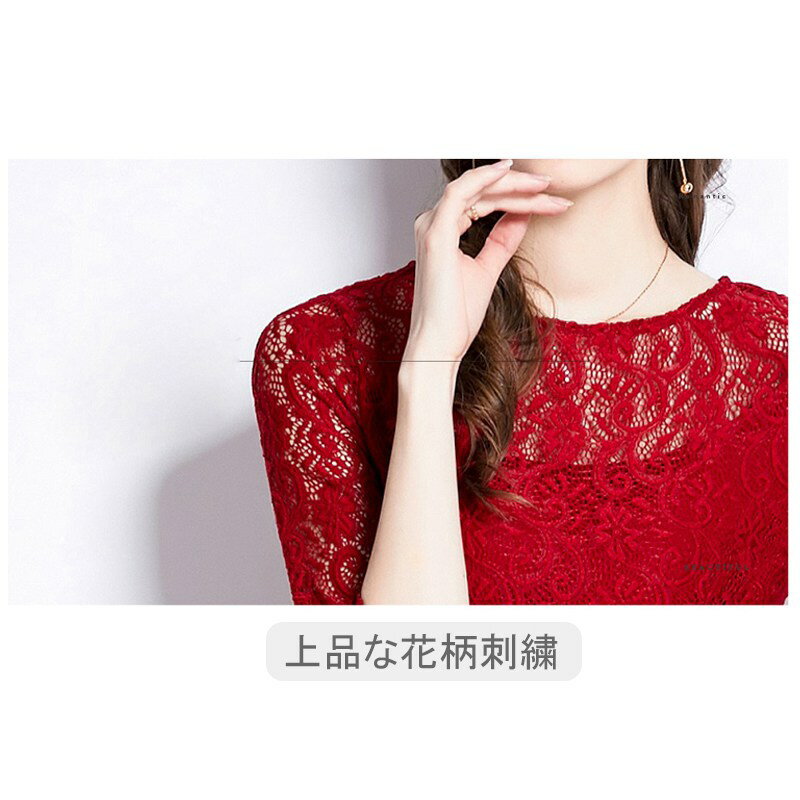 パーティードレス 結婚式 ワンピース ドレス 袖あり 大きいサイズ 花柄刺繍 フォーマルドレス ロング丈 五分袖 二次会 披露宴 お呼ばれ 上品 膝下 他と被らない 体型カバー 40代 30代 20代 50代 春 夏 秋 冬 赤 黒 XS-3XL 短納期