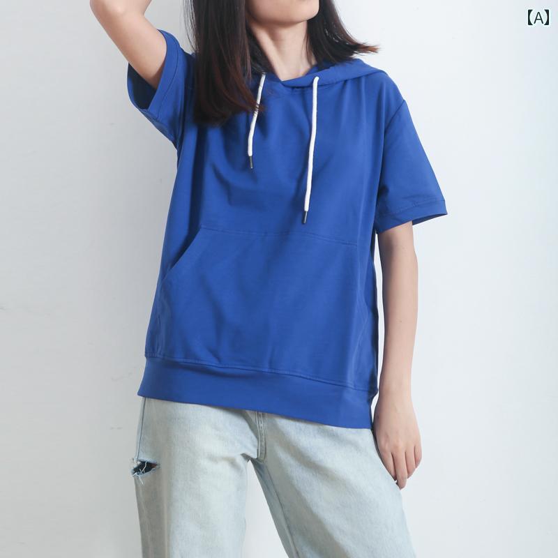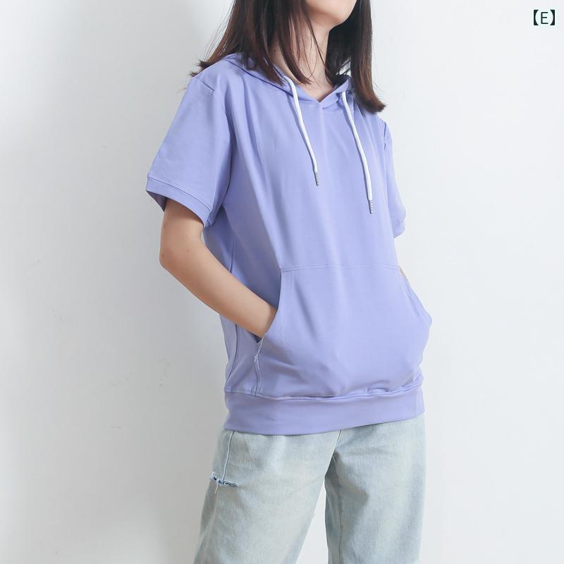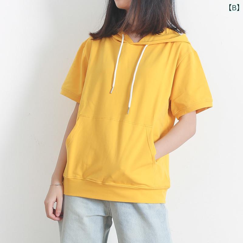パーカー レディース 半袖 トップス スウェット 夏 薄手 コットン フード付き 無地 シンプル カジュアル 韓国 ブルー イエロー ホワイト