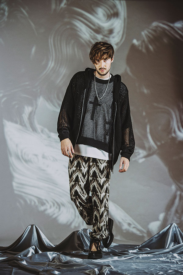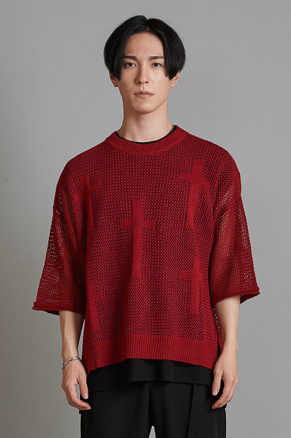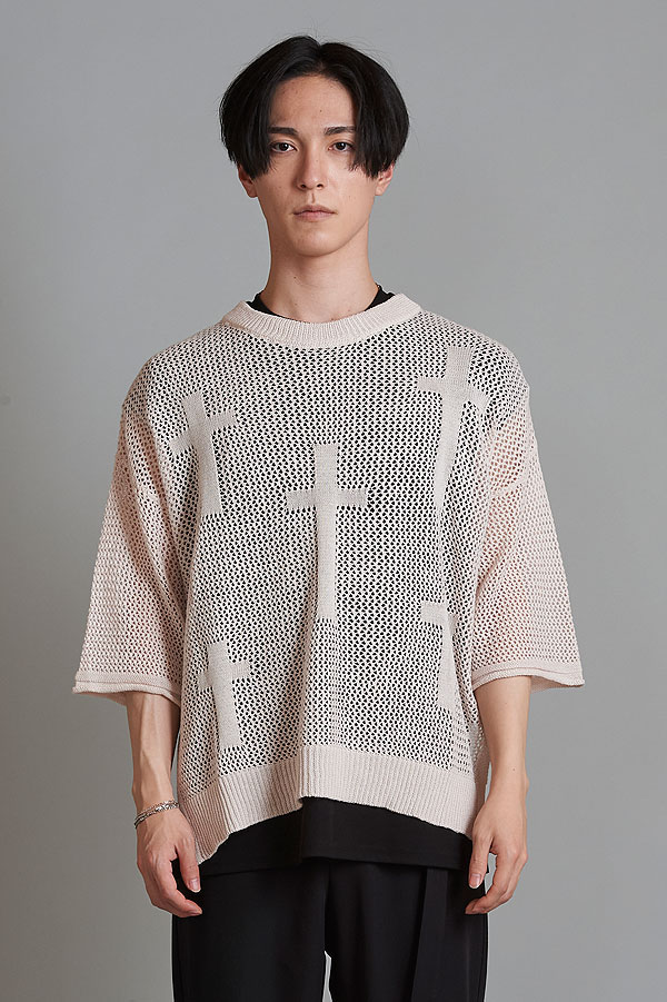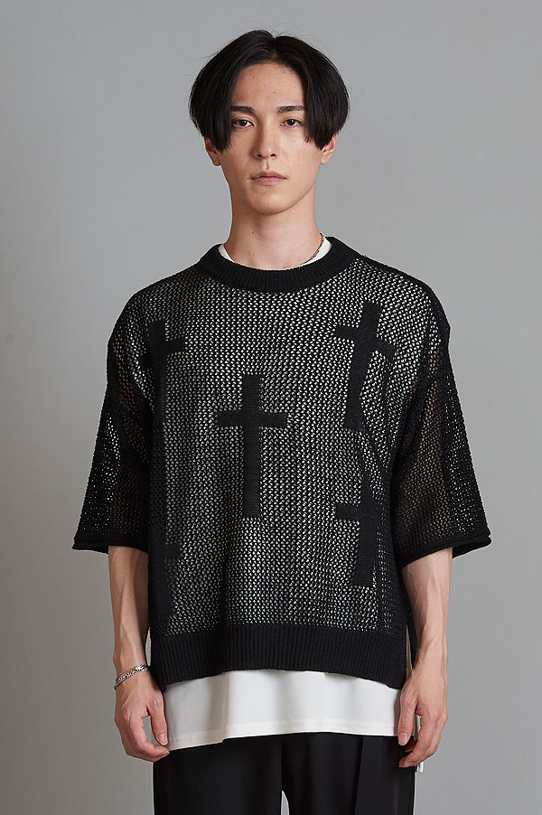50%OFF SALE セール ノーアイディー NO ID. BLACK クロスモチーフレイヤードシアーニットC/N-PO 454010-773k メンズ ニット 5分袖 モード 送料無料