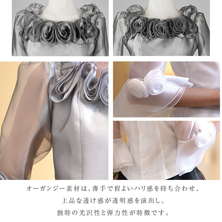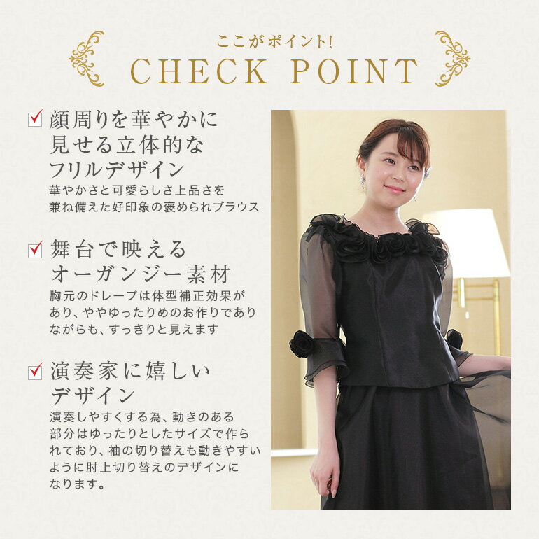 フォーマル ブラウス ステージ 衣装 演奏会 コーラス 黒 白 フリル 5分袖 ピアノ 発表会 カラオケ 舞台衣装 大きいサイズ レディース オーガンジー トップス ピアノ発表会 大人 ドレス 演奏会用ブラウス(bl695)