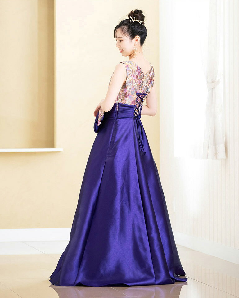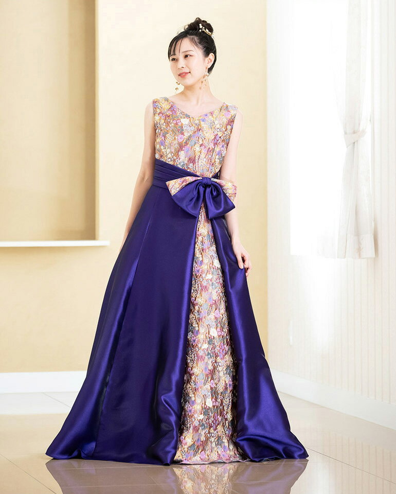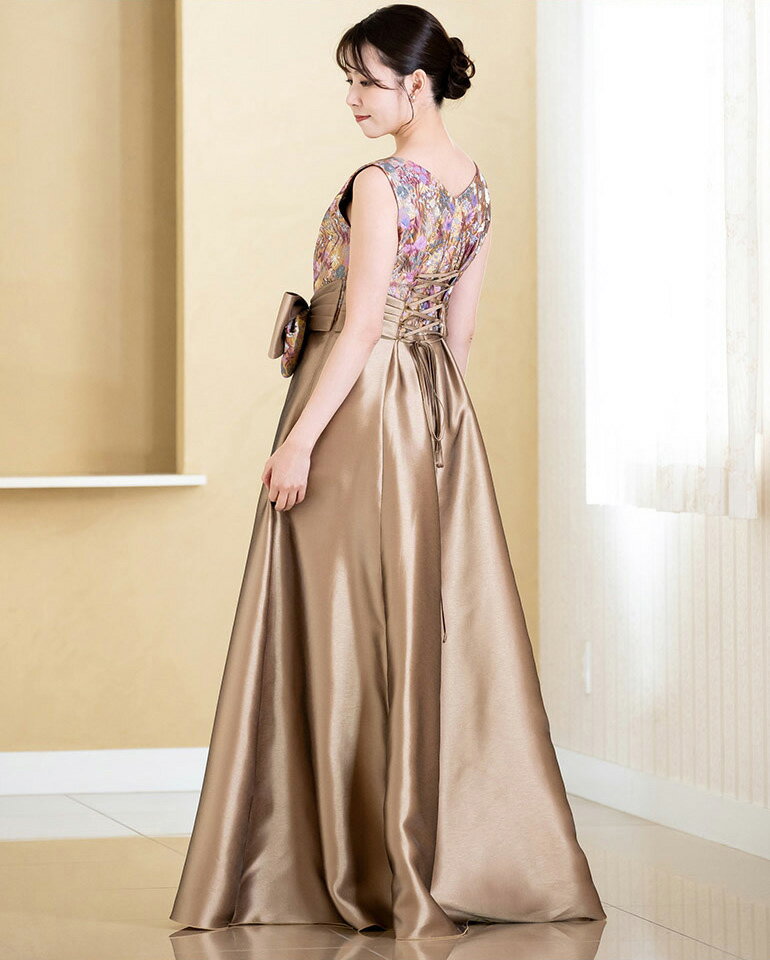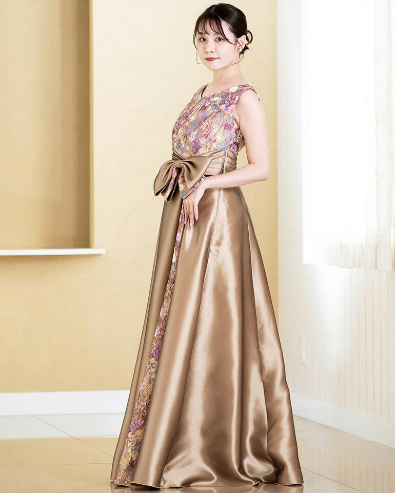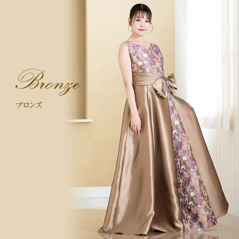 演奏会 ロングドレス 演奏会用ドレス カラードレス 花柄 和風 サテンオーガンジー 2way ドレス 着痩せ 体型カバー リボン ロングドレス 発表会 大人 高校生 中学生 ピアノ ステージ衣装 大きいサイズ ピアノ発表会 袖付き 袖あり 日本製(op3758)