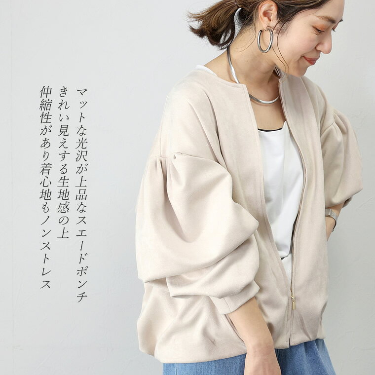 スエードポンチノーカラー袖タックブルゾン 【メール便不可】8月29日午前10時再販開始 アウター ブルゾン ジャケット 羽織り スエードポンチ スエード 華奢 袖デザイン 伸縮 30代 40代 レディース