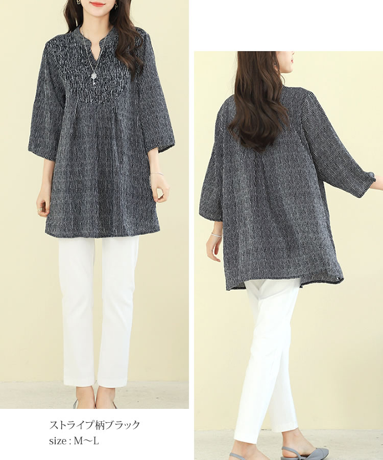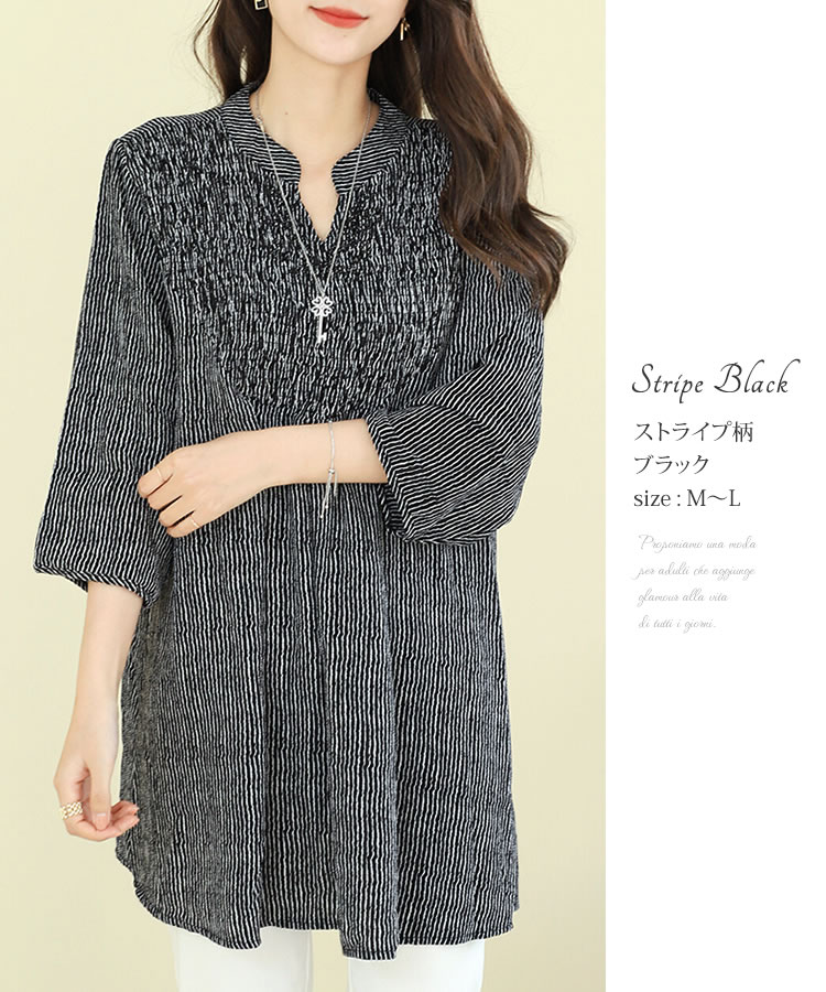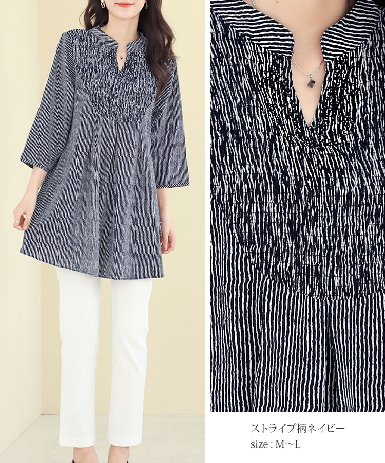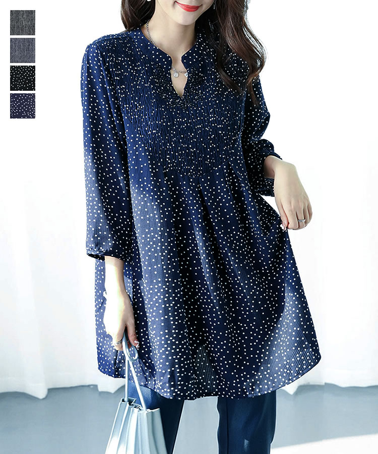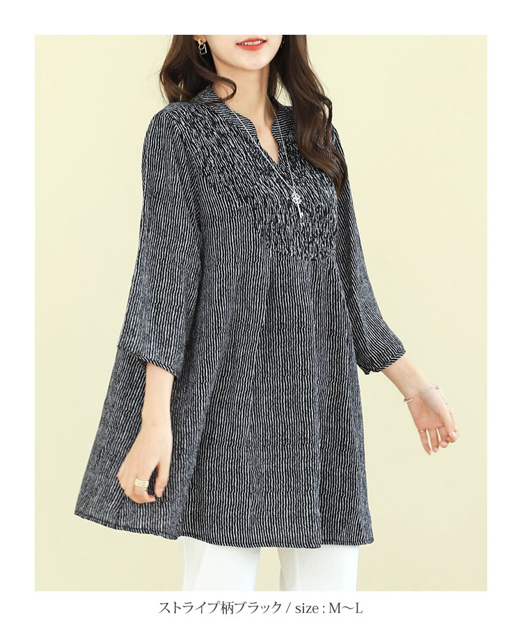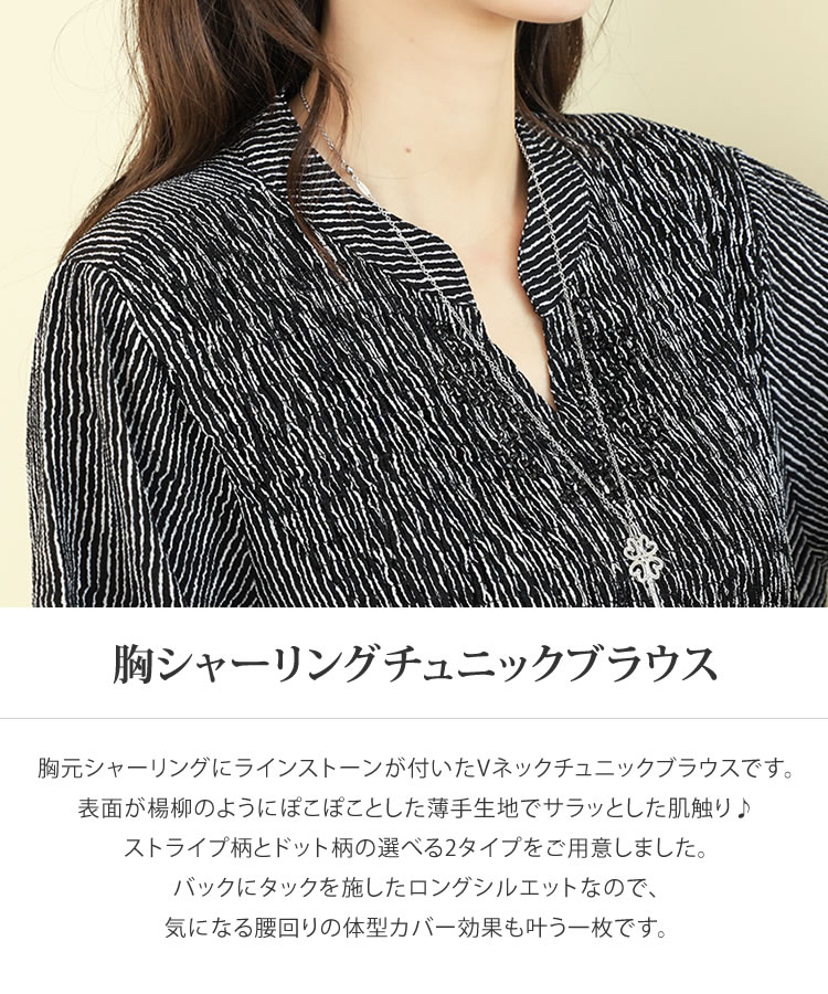 【メール便送料無料】胸シャーリングチュニックブラウス◆レディース チュニック ブラウス 7分袖 体型カバー ゆったり Vネック バンドカラー ロング丈 シャーリング ラインストーン ドット柄 ストライプ柄 30代 40代 50代◆