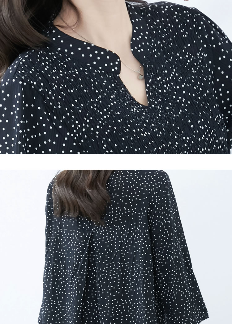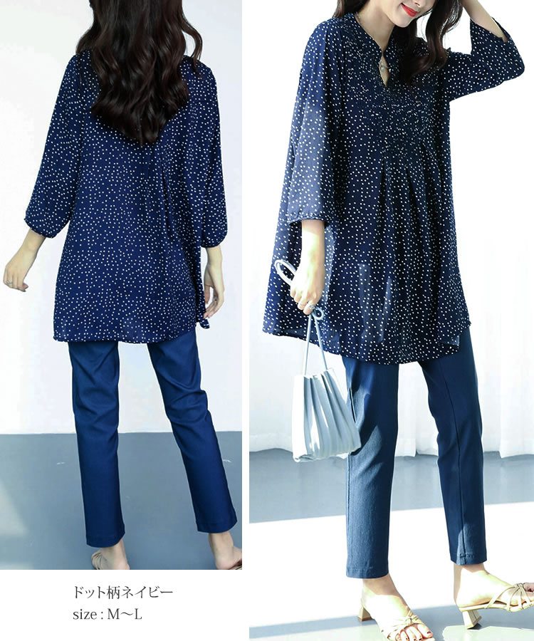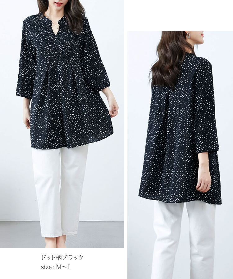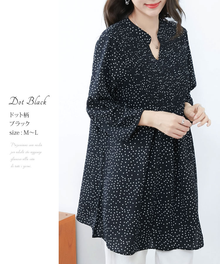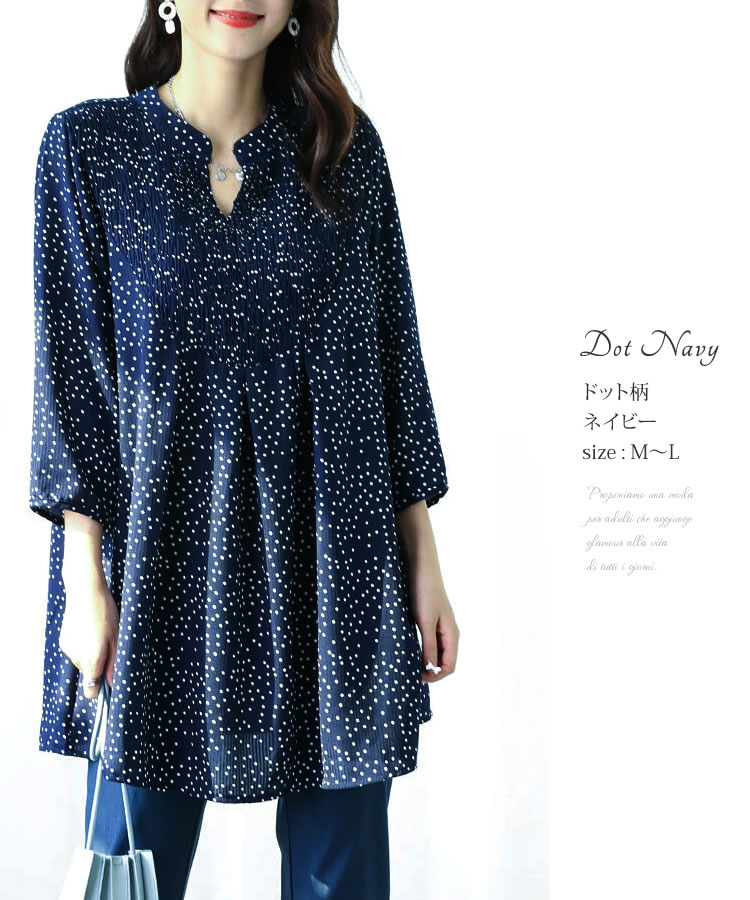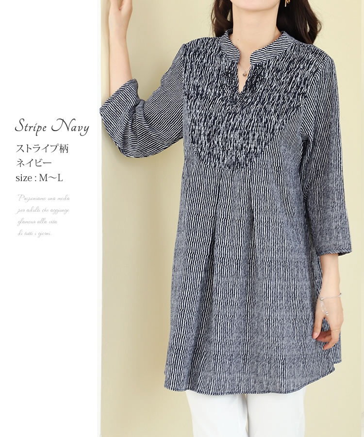 【メール便送料無料】胸シャーリングチュニックブラウス◆レディース チュニック ブラウス 7分袖 体型カバー ゆったり Vネック バンドカラー ロング丈 シャーリング ラインストーン ドット柄 ストライプ柄 30代 40代 50代◆