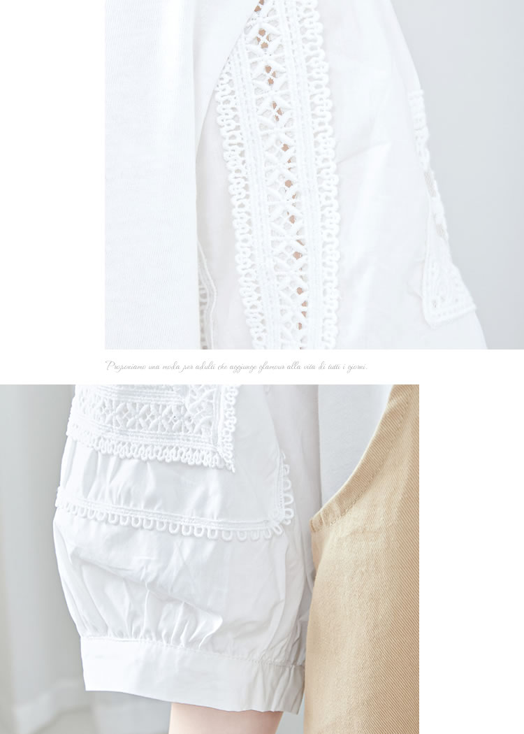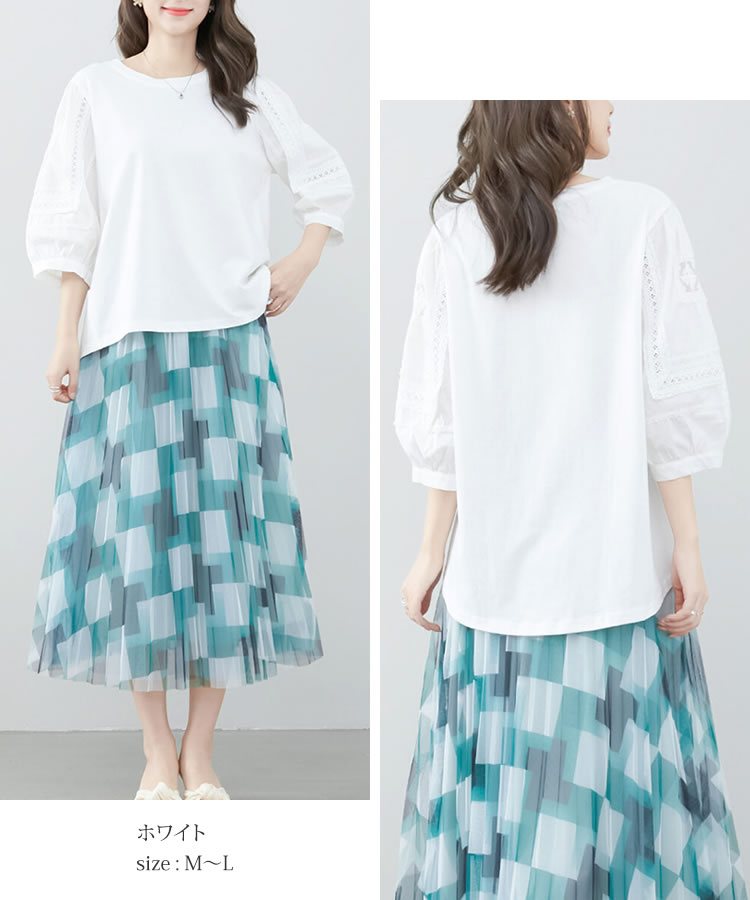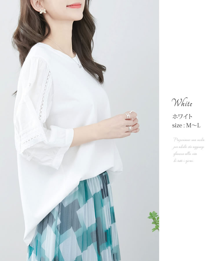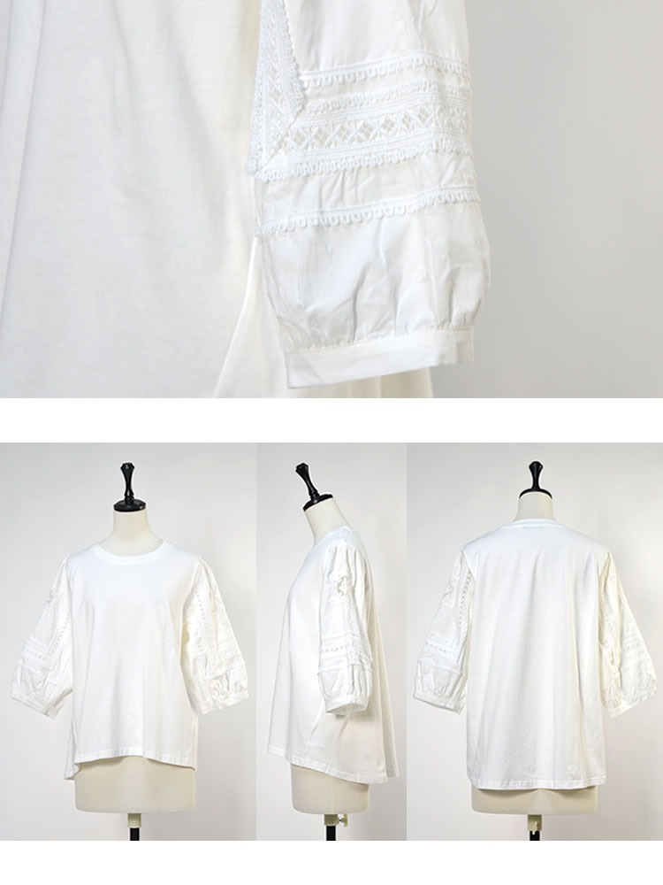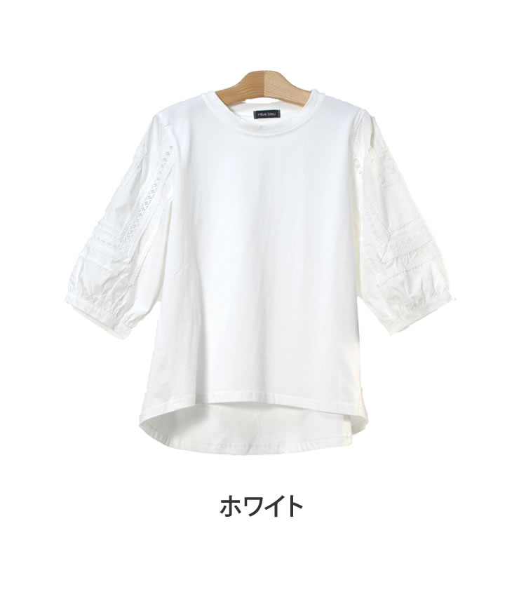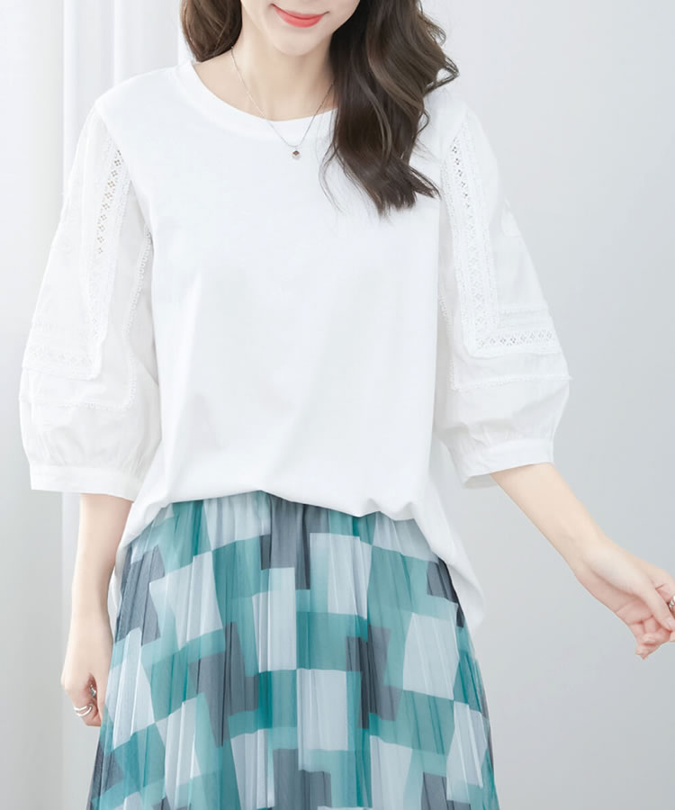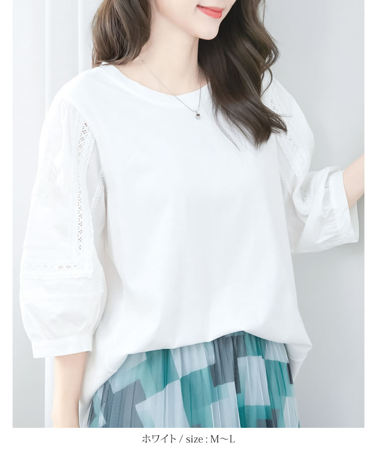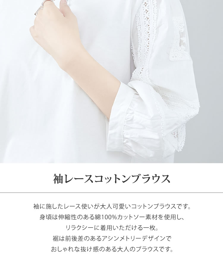 ★期間限定★【メール便送料無料】袖レースコットンブラウス◆レディース ブラウス 7分袖 トップス レース きれいめ リラックス 綿100% コットン ナチュラル 丸首 アシンメトリー 上品 大人 春 夏 30代 40代 50代◆