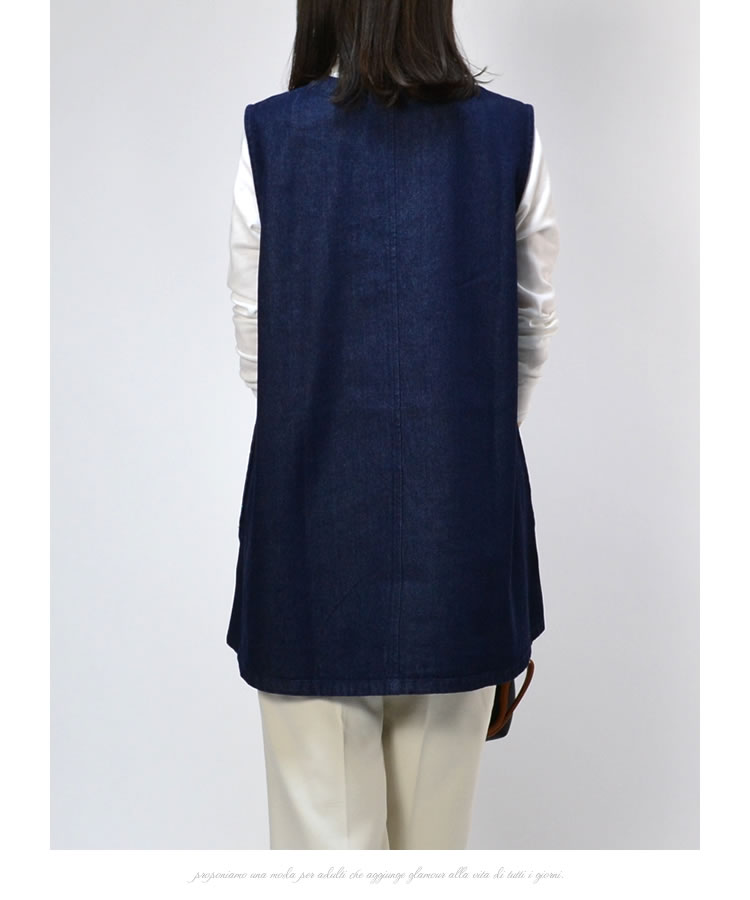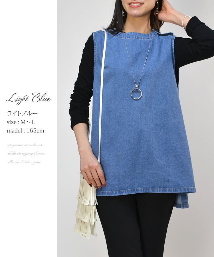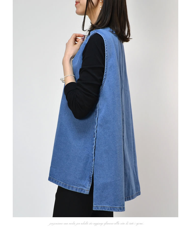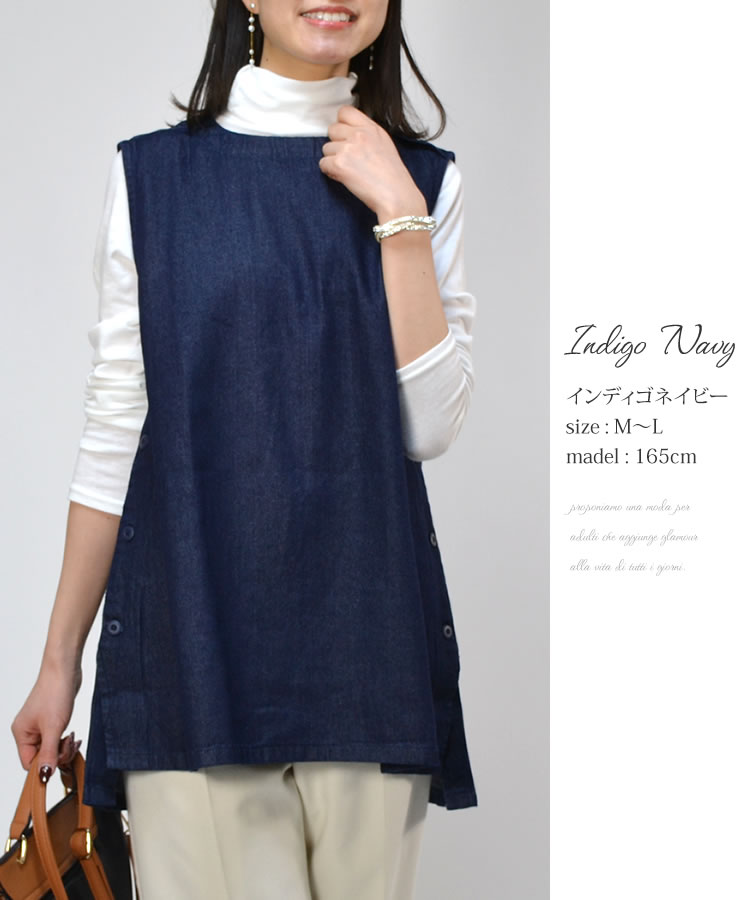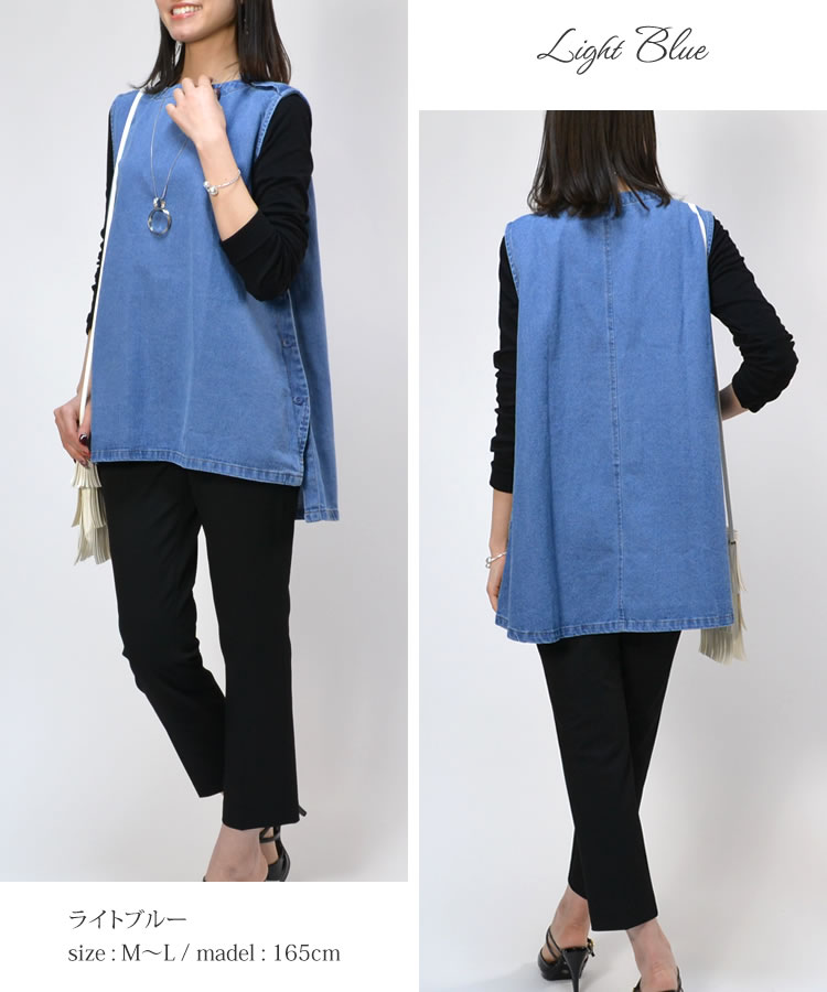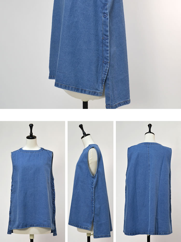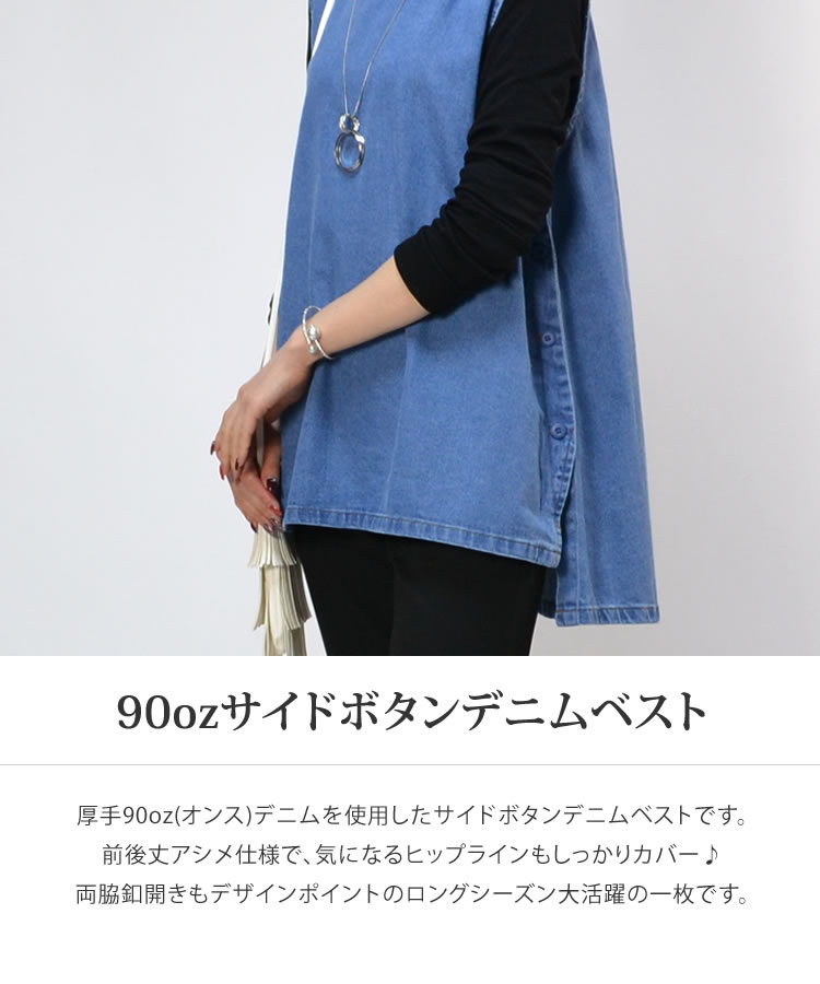 【メール便送料無料】90ozサイドボタンデニムベスト◆レディース デニム ベスト アウター 丸首 ノースリーブ アシンメトリー ナチュラル カジュアル トップス 春 夏 秋 体型カバー コットン 綿 レイヤード 30代 40代 50代◆