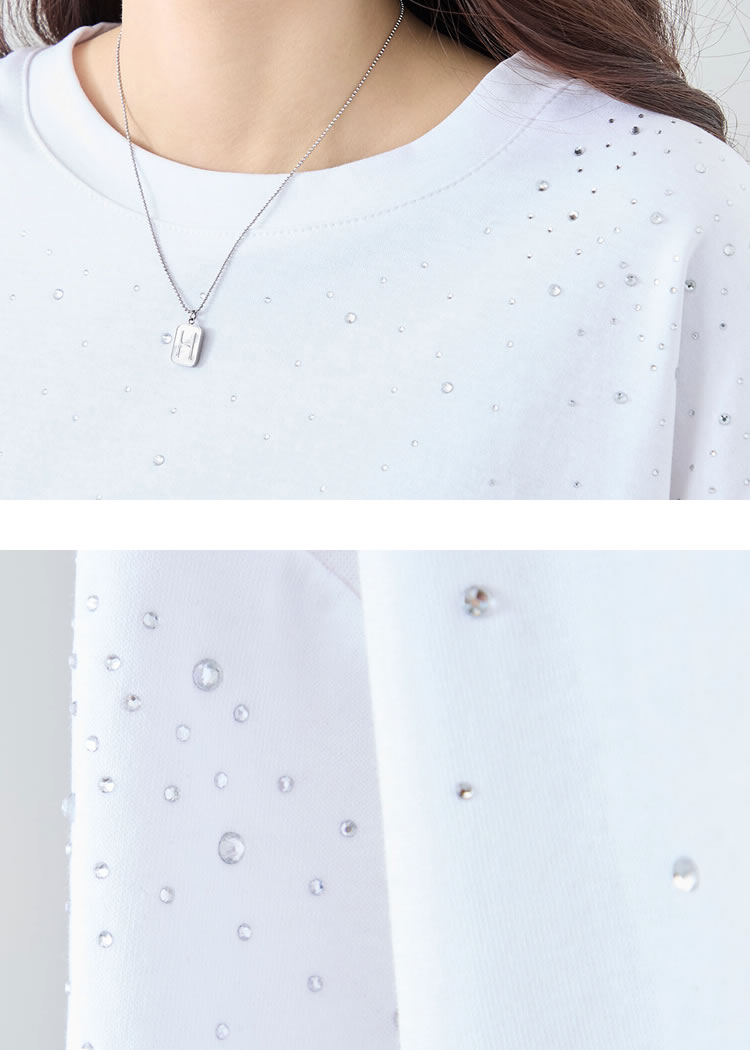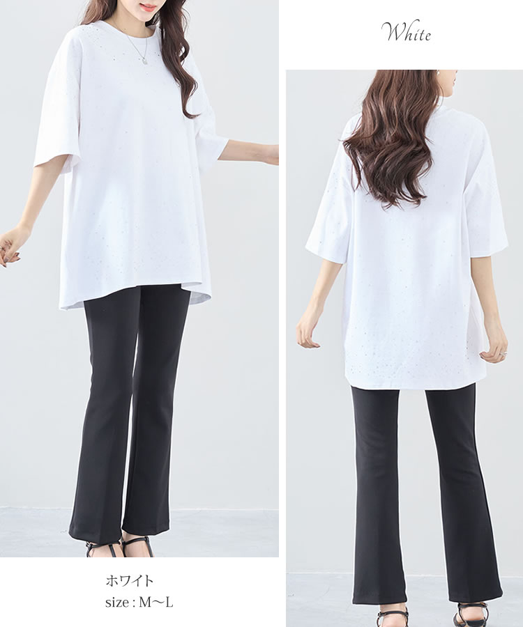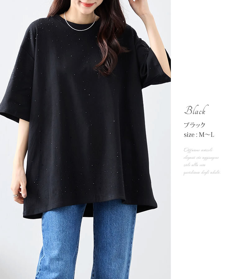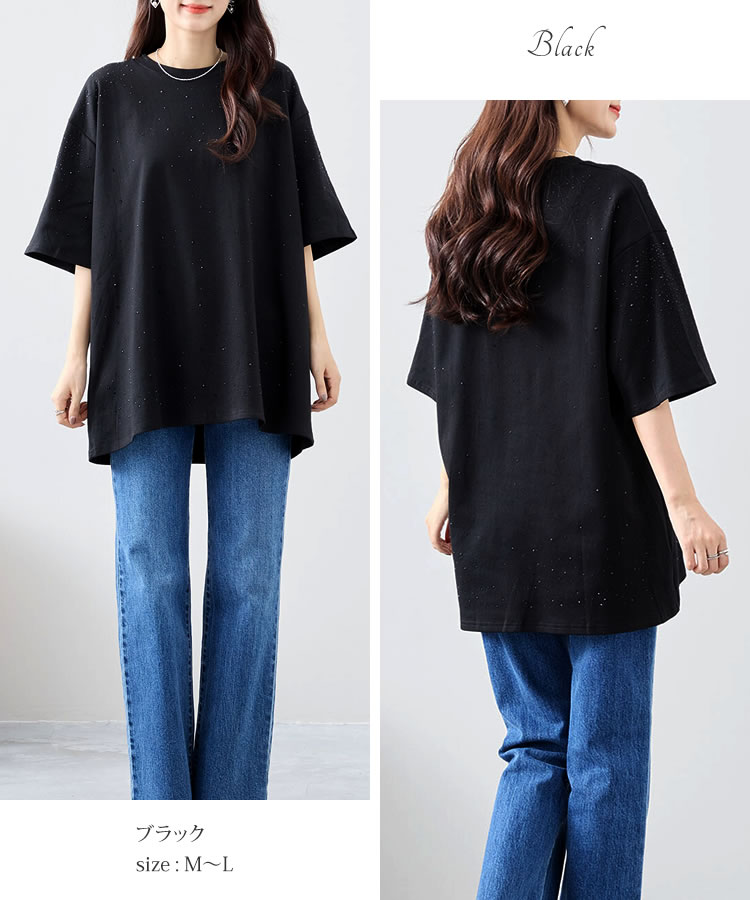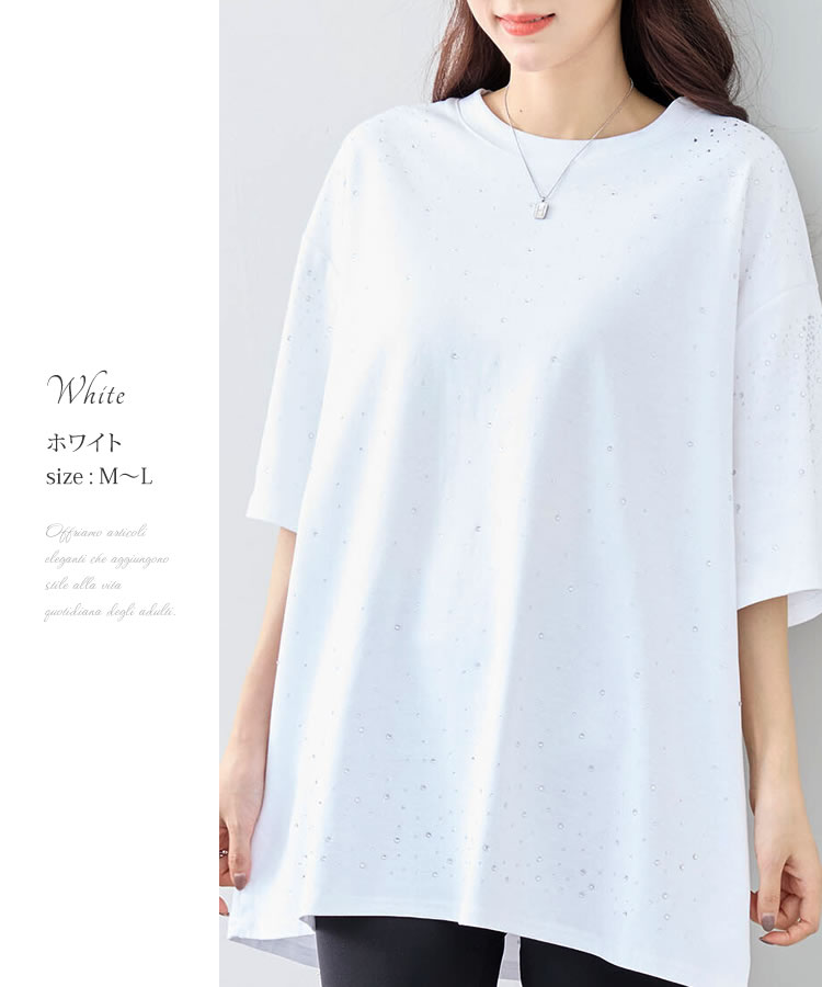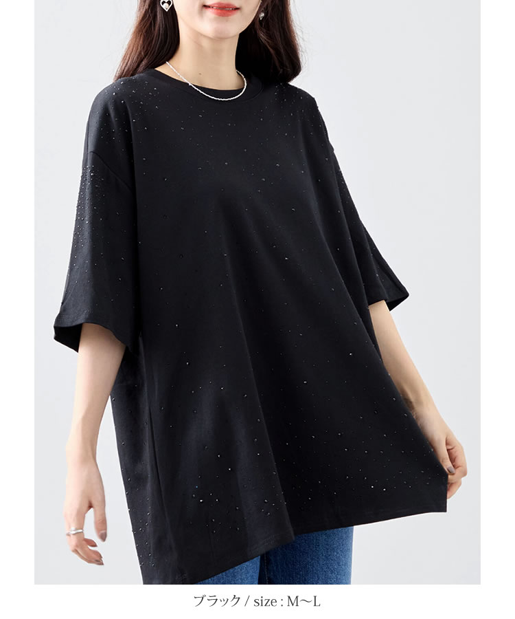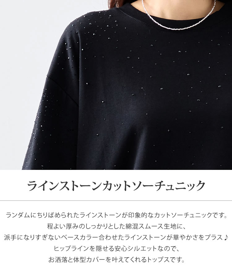 【メール便送料無料】ラインストーンカットソーチュニック◆レディース カットソー チュニック トップス ワイド ロング丈 ラインストーン 綿 コットン 5分袖 フレア シルエット クルーネック 丸首 カジュアル 無地 大人 春 夏 秋
