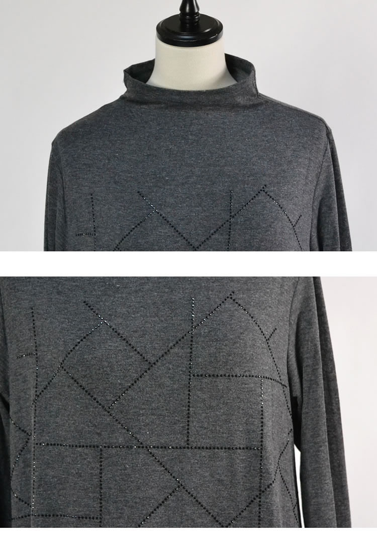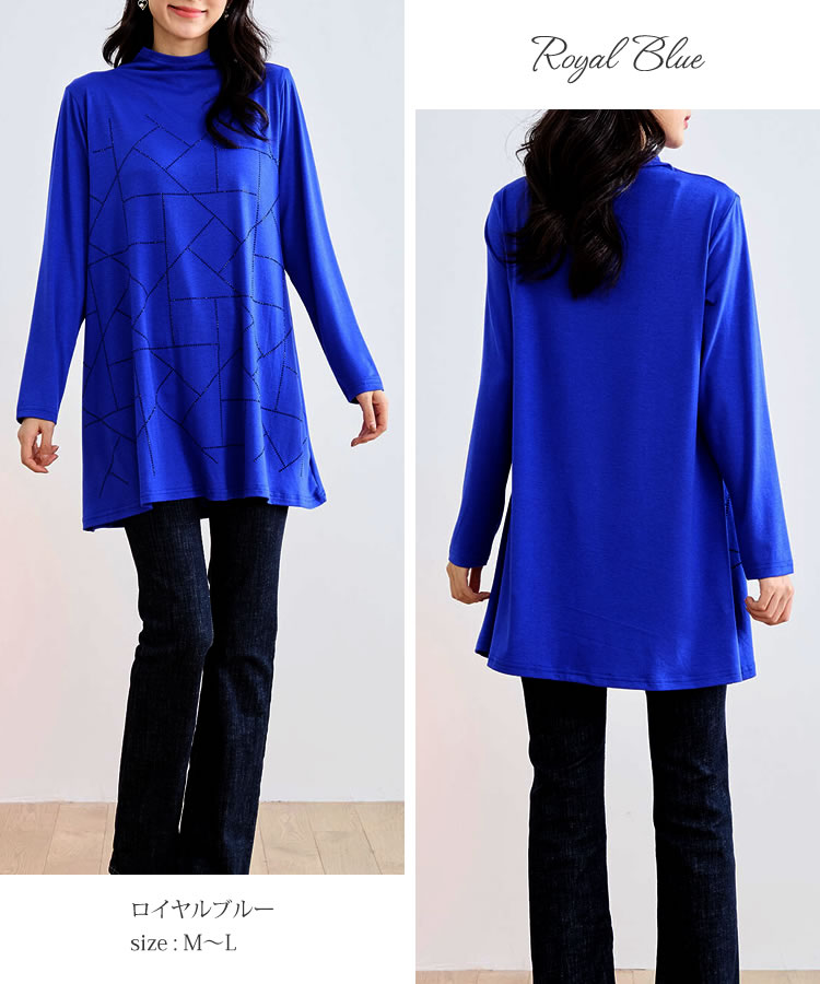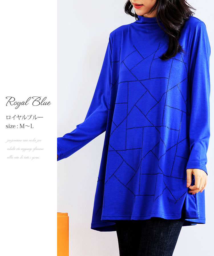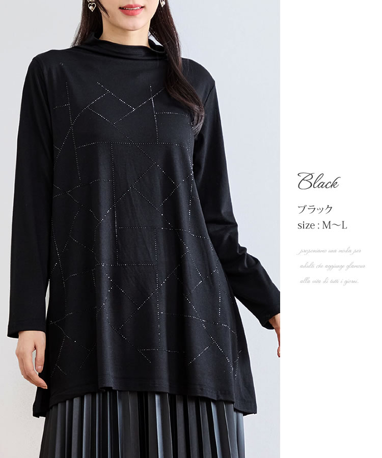 【メール便送料無料】ラインストーンハイネックチュニック◆レディース カットソー チュニック トップス ロング丈 ラインストーン 長袖 フレア 体型カバー ハイネック シルエット カジュアル 幾何学柄 大人 秋 冬 春