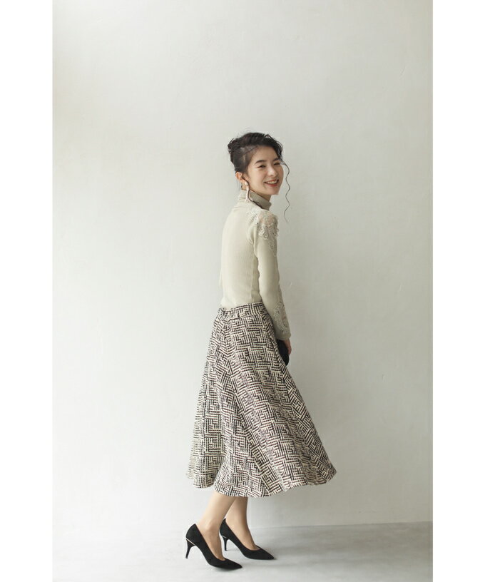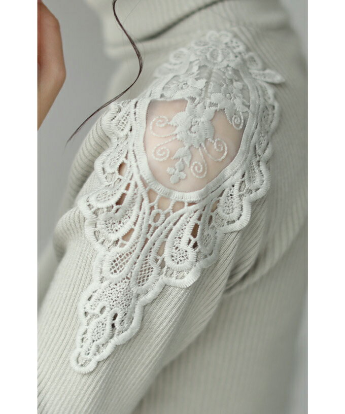 訳ありアウトレット(S~3L対応)(ミントベージュ)美しく透ける肩と袖レースのタートルネックニットトップス