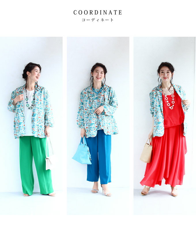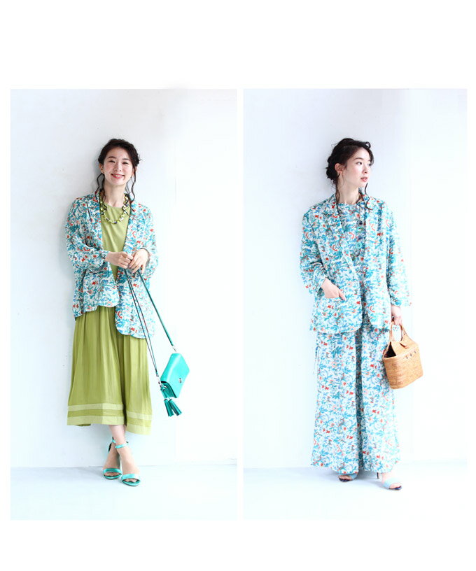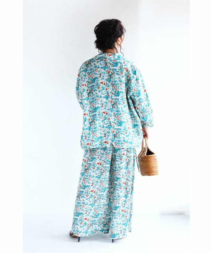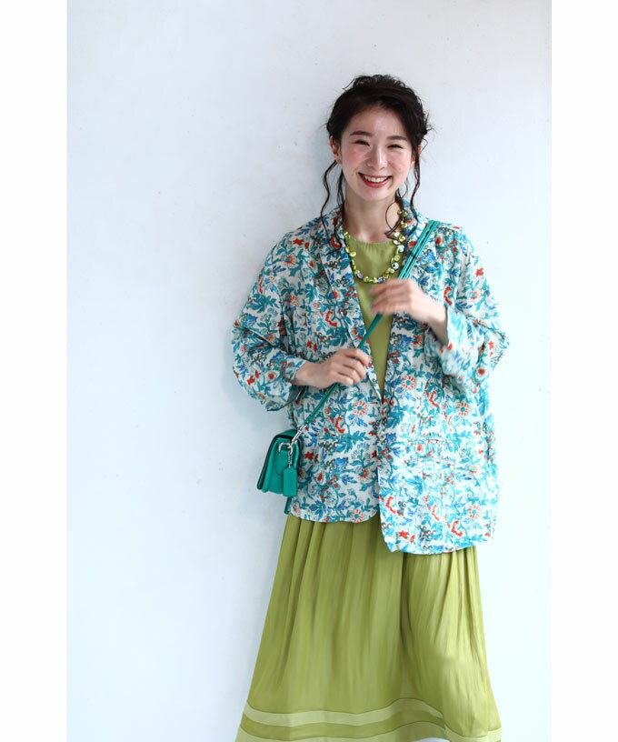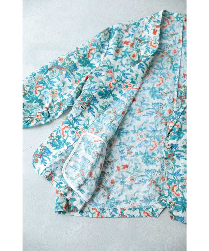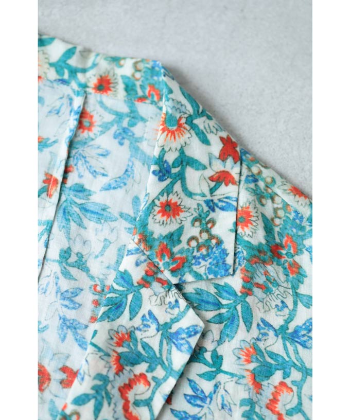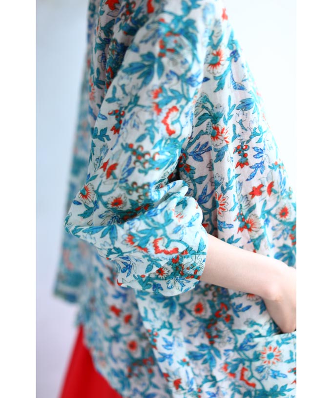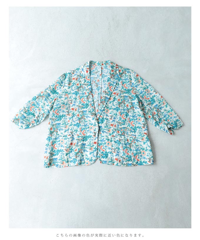 (S~L対応)朱の花を咲かせたブルーボタニカルなリネンジャケット【定価17242円】