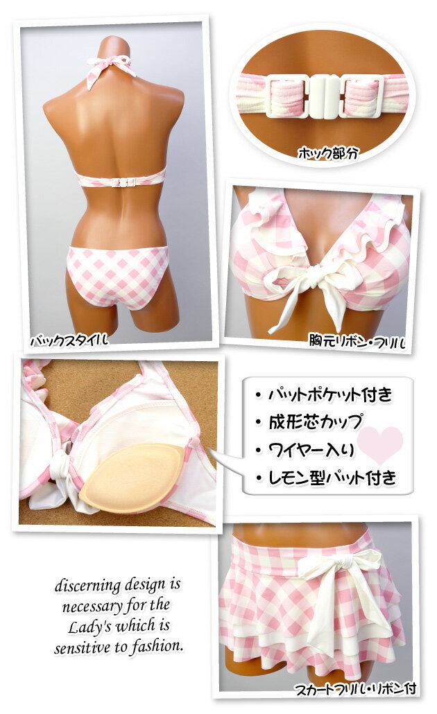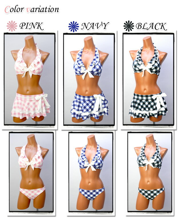 【送料無料】【水着】【レディース】【SANEORIGIN】【3点セット】チェック柄・フリル&リボン飾り スカート付きホルタービキニ