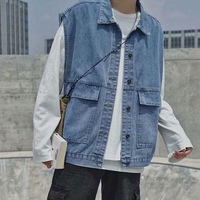 デニムベスト メンズ ベスト デニム ノースリーブ ジャケット ゆったり オーバーサイズ デニムジャケット 袖なし 重ね着 レイヤード トップス 前開き ポケット付き ウォッシュ加工 お洒落 カジュアル ヴィンテージ BF風 ストリート 春 秋 送料無料