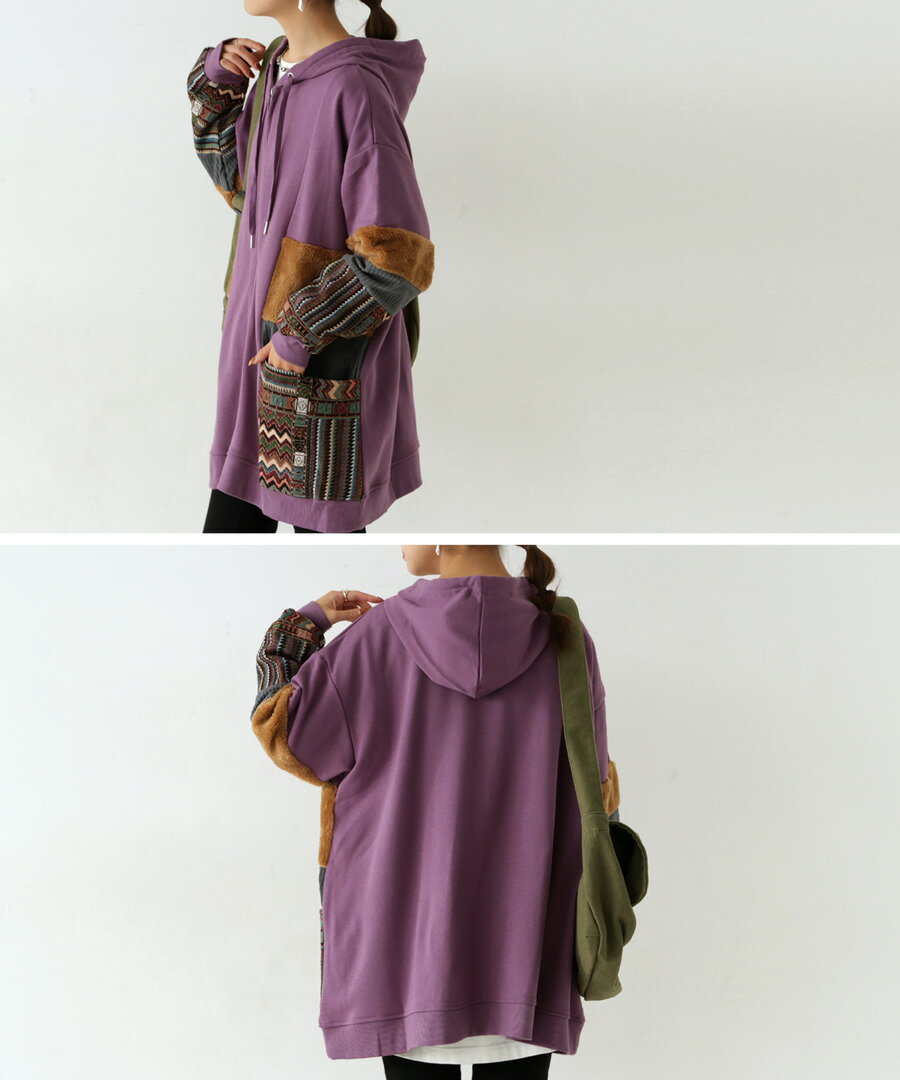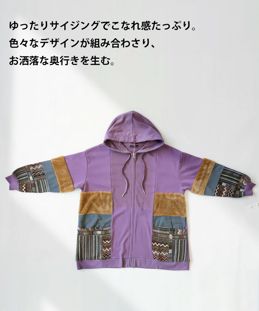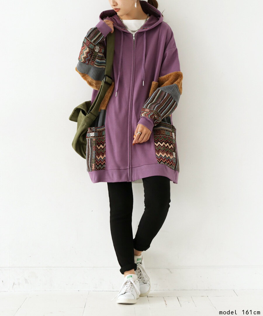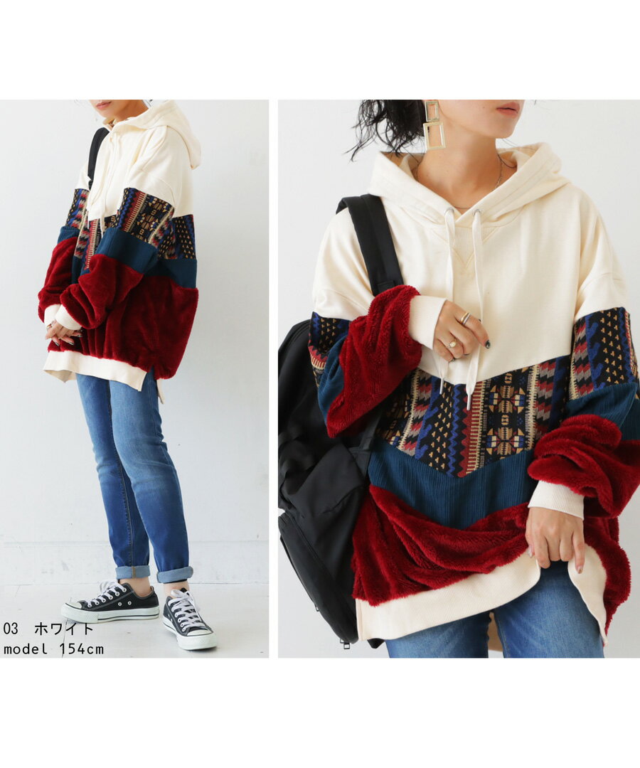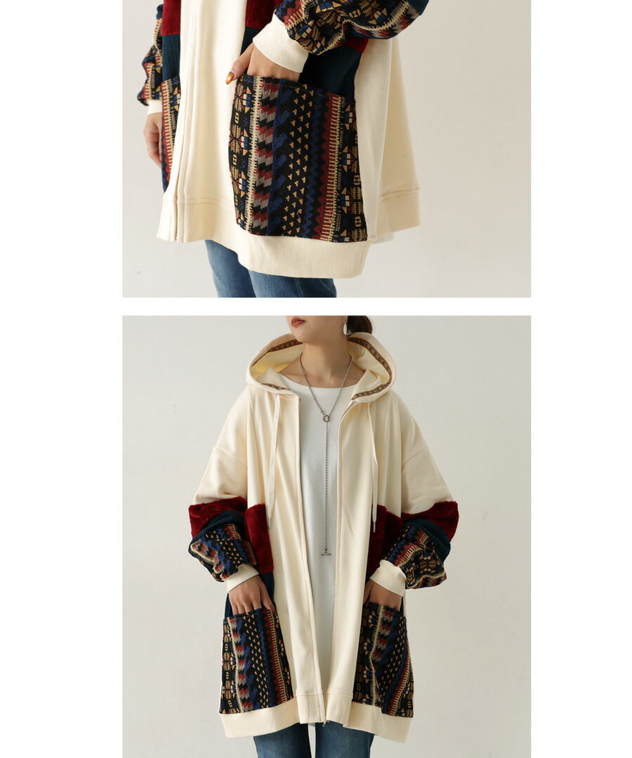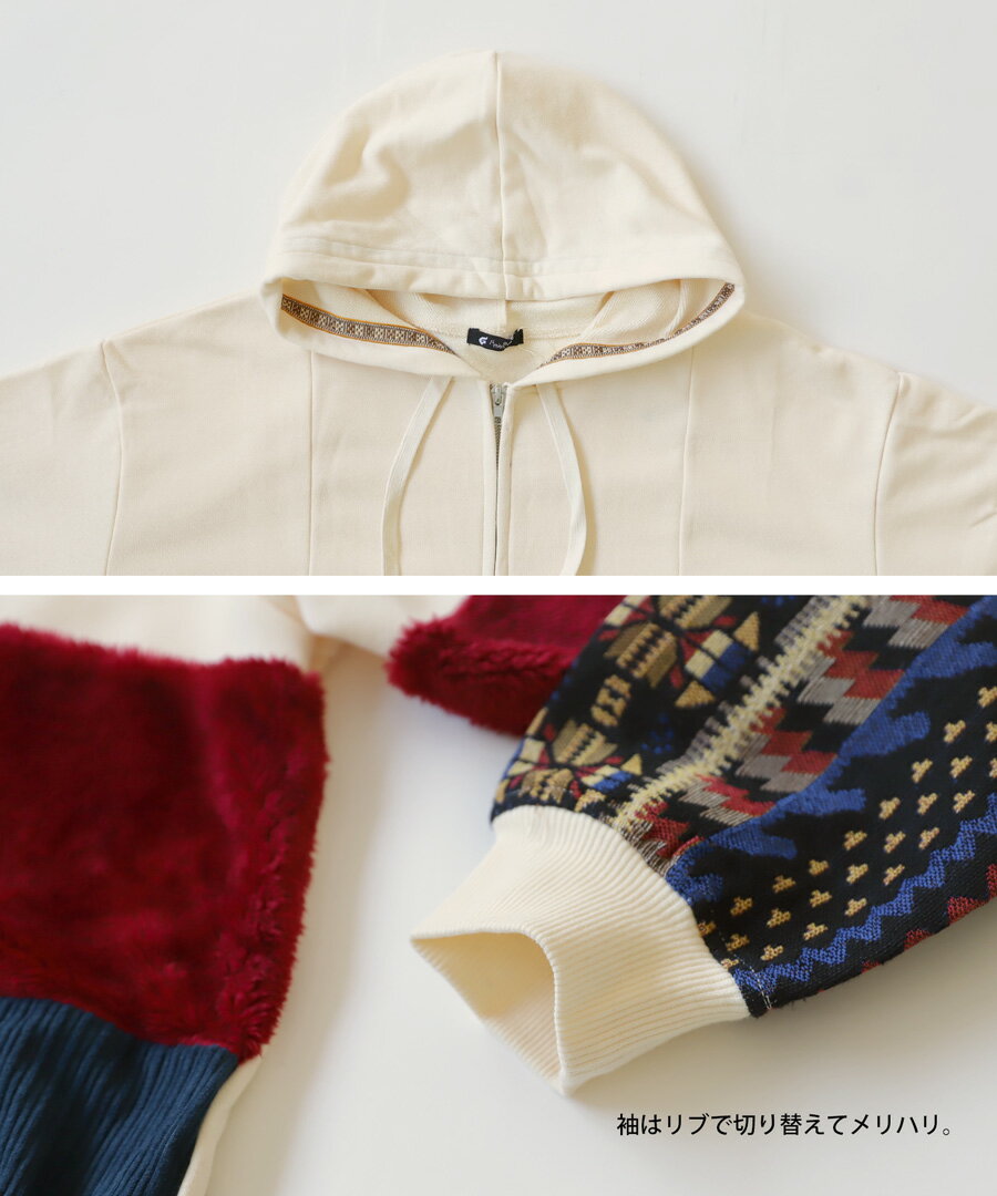 トップス アウター 異素材 パーカー パッチワーク コーデュロイ ネイティブ柄 前後差 ラウンドヘム スリット 秋冬 ボリューム ゆったり ナチュラル カジュアル レトロ ヴィンテージ 大人 レディース おしゃれ 誕生日 プレゼント AminaCollection